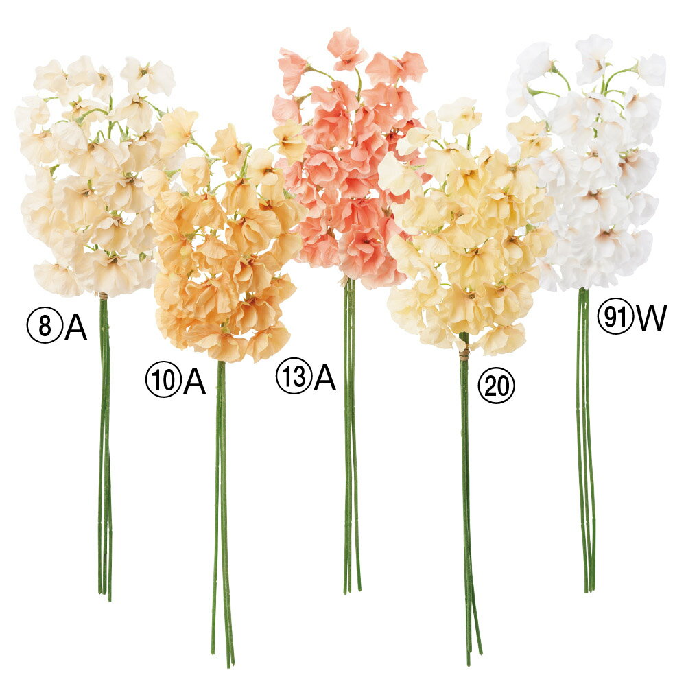 【サイズ】L60 花径3.5〜5cm材質:ポリエステル・ポリエチレン●商品名の「×(数字)」は輪数の目安です。本数ではありません。・造花は人の手作業で作られており、一つ一つに生のお花同様の個体差があります。シワ・ほつれ等はリペアを施してご利用ください。・お花・実・葉は茎から取れる仕様になっているものが大半です。お届け時に取れてしまっている場合は付け戻してご利用下さい。【はなどんやお取り扱い商品について】■はなどんや掲載商品には、在庫品とメーカーお取寄商品がございます。掲載納期をご参考にされて下さい。即日発送の納期が記載されている商品でも、当店在庫が欠品となった場合には、お取り寄せにてご手配を進めさせていただきます。※コンビニ支払い・銀行振込等、前払い決済でのご注文については即日発送の対象外となります。■他店舗でも販売をしているため、また、メーカーの実在庫欠品等によりご注文後にご用意ができなくなる場合がございます。その場合にはメールにてご案内をさせて頂きます。■分納は承っておりません。一番遅い納期の商品に合わせて発送となります。20210406new/asca no.246 2021 春夏/bkz-15/bkz-0015/bkz-0303/bkz-0503造花(アーティフィシャルフラワー) 造花 花材「さ行」 スイトピー/ブライダル;