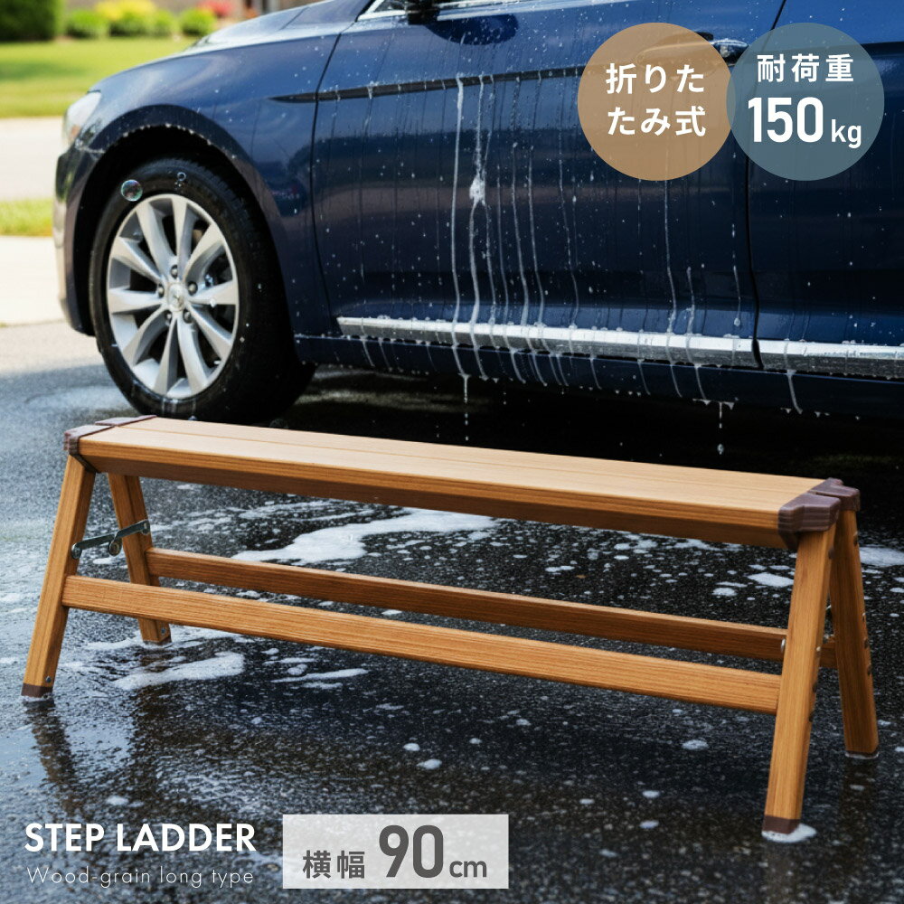足場台 アルミ 洗車 幅90cm 高さ29cm ワイド ロング 長い 脚立 踏み台 ステップ台 折りたたみ はしご 梯子 木目調 おしゃれ スツール コンパクト スリム 耐荷重150kg 折り畳み 屋内 屋外 軽量 軽い 収納 高所 作業 滑り止め ブラウン