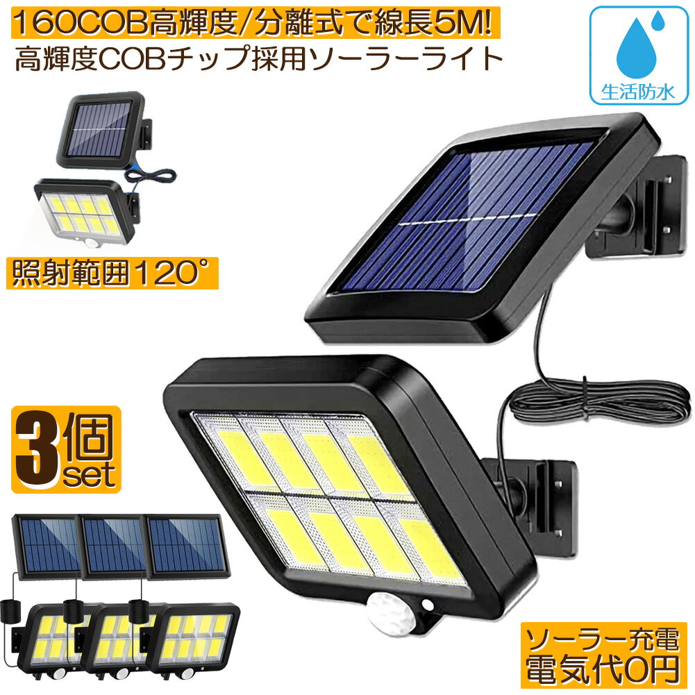 ソーラーライト センサーライト 防犯ライト 3個セット 屋外 COBチップ採用 160COB 3モード 120° 照明範囲 ソーラーライトモーションディテクター 5Mケーブル付き 防水 自動点灯 屋外照明 庭 玄関 ガーデンライト 駐車場 停電緊急対策 防災ライト