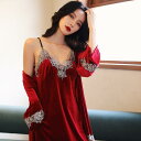 ルームウェア レディース 秋冬 ベロア パジャマ 長袖 Vネック カップ ネグリジェ ガウン 2点セット セクシー ワインレッド ブライダル 花嫁 お祝い 部屋着