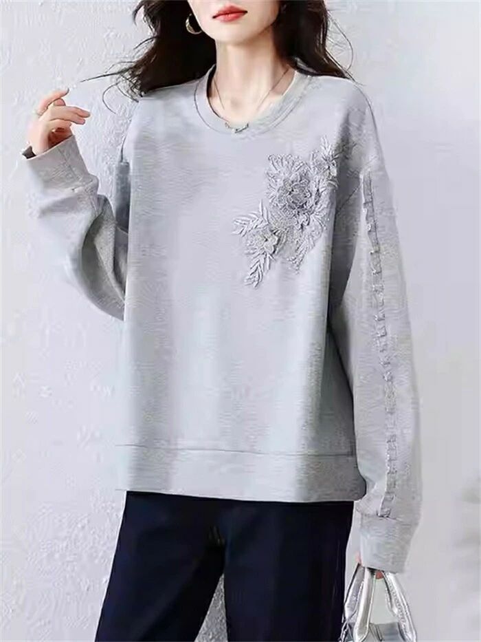 トレーナー レディース 春 秋 長袖 トレーナー クルーネック Tシャツ 無地 立体花柄刺繍 トップス トレーナー カットソー スウェット 華奢魅せ デザイン 上品 薄手 大きいサイズ ビッグシルエット ゆったり 着回し 体型カバー カジュアル 通勤 通学