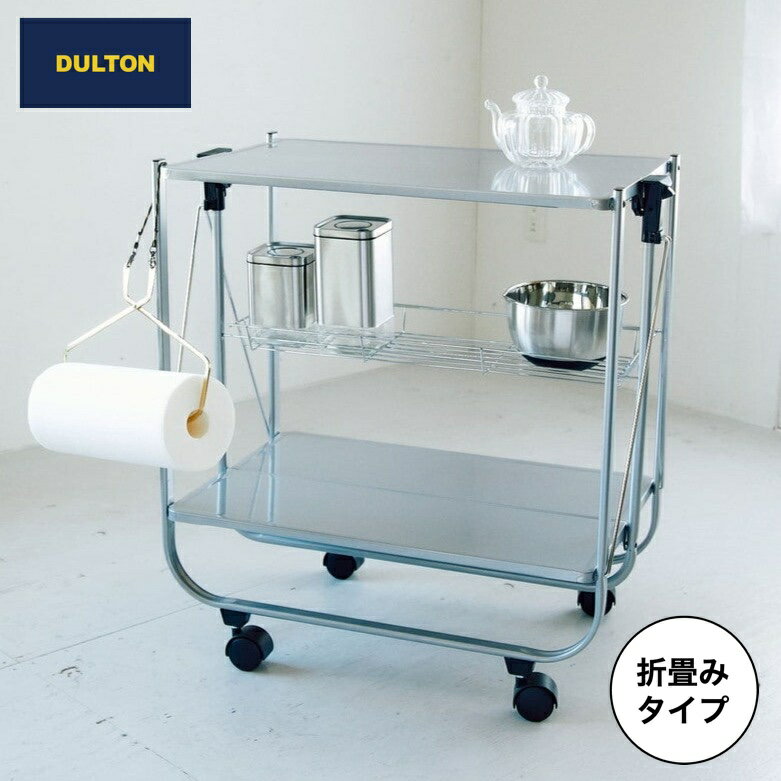 \レビュー投稿で「次回使える10%OFFクーポン」がもらえる!!/ 当店では、商品やサービスの向上のため、ご意見やご感想を募集しております。ぜひみなさまのお声をお聞かせください。 商品到着後に「商品レビュー」を投稿していただいた方全員に「次回使える10%OFFクーポン」をプレゼント。 ※プレゼント条件:商品レビュー投稿いただいた方が対象 ※プレゼントが無くなり次第終了となります。あらかじめご了承ください。フォールディング トローリー シンプルな折り畳み式のトローリーです。 キッチンやダイニングでの調理、配膳などの作業効率がアップする機能的なキッチンワゴン。 調理のときは食材やボウルなどの調理器具を置いたり、料理本を開いて置いておいたり、広い天板を作業スペースとして活用できます。 できあがったお料理はお皿に盛り付けて天板の上へ。 キャスター付きなのでそのままダイニングテーブルまでまとめて運んでいくことも可能です。 中段にはスチールラックもついているので、キッチン周りの小物や食材などもすっきりとまとめて収納できます。 ラックは天板の半分の奥行なので、背の高いものを底板に置くときも邪魔になりません。 使わないときには折りたたんで厚さ約7.5cmのコンパクトサイズにすれば、余分なスペースを取らずにすみます。 壁に立てかけておいたり、クローゼットなどに収納したりと実用的なワゴンは、1台持っていると大活躍間違いなしです! 【商品詳細】 ・サイズ:H690mm × W.690mm × D.405mm Folding:H.885mm × W.690mm × D.75mm ・生産地:台湾 ・素材:スチール 【注意事項】 ※組み立ての際、手や指を挟まぬようご注意下さい。 ※ご使用前には、必ず各部分の破損、損傷がないことを確認して平坦な場所でご使用して下さい。 ※本製品に飛び乗ったり、寄り掛かったりしないで下さい。 ※ご使用中にがたつきが生じた場合は、組み立て同様の方法でレンチで締めなおして固定して下さい。 ※沖縄・離島への配送は不可となります。 [DULTON(ダルトン)] 1988年創業のインテリア雑貨メーカー。 誰もが使うあたり前に在る道具、身の回りのひとつひとつを今よりもっと面白くすることで「道具を愉しむ、もうひとつの豊かさ」を提案。