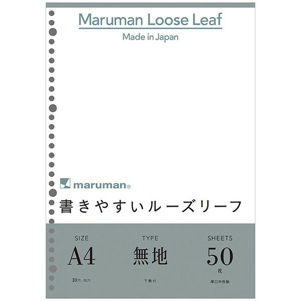【ご注意】・商品画像はサイズ違いや色違いを含む代表画像(イメージ)を使用している商品がございます。 ・モデルチェンジ等により仕様や色等の変更が生じる場合がございます。・画像の商品数と販売数は異なる場合がございます。(例:画像が2本でも販売は1本単位等)※販売単位が不明な場合は当店までお問い合わせくださ。商品画像とサイズ・色が違う等での返品・交換はお受けできませんので最終的な仕様等不明な点はメーカーHP等にてご確認くださいますよう、よろしくお願い致します。【メーカー】●マルマン(株)【特長】●学校で、ビジネスで、プライベートで、毎日使うものだから少しでもストレスなく使えるルーズリーフです。●色々な筆記具で書き心地をテストし、裏抜けしにくく、にじみの少ない、とても書きやすいルーズリーフを作りました。●長期保存に耐える国産厚口中性紙です。【仕様】●規格:A4●タイプ:無地30穴●縦(mm):297●横(mm):210●穴数(個):30●中紙(枚):100●厚さ(mm):10●罫線:5mm方眼罫【材質・仕上げ】●本文:筆記用紙80g/[[M2]]【1注文あたり入数】●100枚【質量】●510.000G商品詳細はオレンジブックカタログ2025年の【12巻0833ページ】をご確認下さい。※紙カタログと電子カタログではページが異なる場合がございます。掲載画像はオレンジブックカタログ年初出時のものです。現在の仕様(色・形・細かな性能等)と異なる場合がございます。またサイズ違い等画像がすべてご用意できない場合には、サイズ違いをイメージにて掲載している場合がございます。メーカーHP等で現在の仕様をご確認下さいますようお願いいたします。使用用途に影響のない画像との違いでの返品・交換は致しかねますのでご了承下さい。オレンジブックカタログでは多数のメーカー製品を取扱っております。メーカーによっては店内別ページにて他流通ルートの同等品が別価格で販売されている場合がございますが価格等は購入ページのものとなり変更はできかねます。あらかじめご了承ください。
