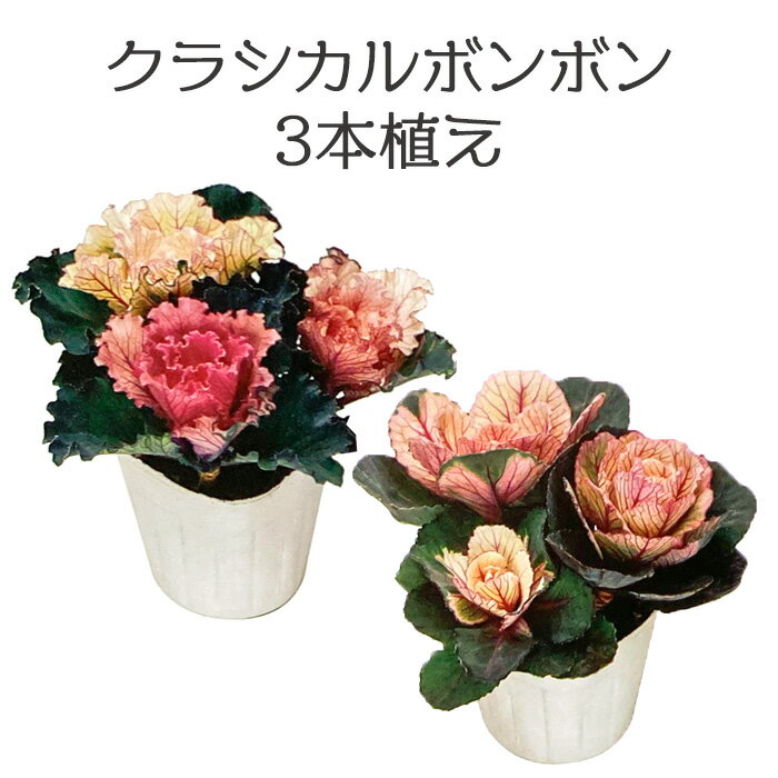 【同梱可】同梱可の花苗、鉢などとまとめてお届けできます。 同梱不可以外の送料無料商品、3,980円以上お買い上げの場合は送料無料(一部地域除く)になります。 【商品名】カネコ 葉牡丹 クラシカルボンボン 3本立ち 3号 【品種】丸葉タイプ/フリンジタイプ ※品種をお選びください ※1ポットに付き3本立ちです 【色についてご注意ください】個体差・色幅の大きい品種です、白色〜桃色、紫色のものがございます。色指定や同じ様なものを揃えて等はできません、ご了承の上お買い上げください。 【サイズ】9cmポリポット 3号 【ご注意点】植物生産物と言う特性上モニターの色そのままと言う訳には参りません事、色等はあくまで一例となります(個体差・色幅が大きい品種です。写真にない色もあります。)事予めご了承下さいませ。 【特長】●白・桃色ベースの葉に葉脈がきれいに色づく、とても雰囲気の良い葉ボタンです。 ●クラシカルな姿で、寄せ植えの主役にぴったりです。 【管理】 ・日当たりがよい場所を好みます。 ・排水性が良い土を好みます。 ・肥料は、市販の緩効性肥料を控えめに与えてください。葉ボタンは肥料を多く必要とはしません。 ・水やりは土の表面が乾いたらたっぷりと与えてください。 植え付け後根が活着するまでは乾かさないように注意します。 ・花芽(トウ)が立ってきたら、とにかく早めに切る様にしてください。 ※肥料はほとんど与えません。肥料を与えすぎるとキャベツのように結球して発色が遅れるので、注意します。 【ポイント】黄色くなって見た目の悪い下葉は適宜取り除いてください。 【用途・飾り方】 花壇 鉢植え ハンギングプランター お正月 クリスマスリース 豪華 葉ボタン 珍しい ハンギング リース 門松 寄植え 【関連品】 葉牡丹関連品はこちら リース作りに【送料無料リースセット】 【よくある質問】Q:どのくらい楽しめますか? A:春まで楽しめます。通常の葉牡丹はお正月イメージ過ぎて春まで植えるのをためらいますが、こちらはブーケの様な綺麗さで長く寄せ植えや花壇に飾れます。トウ立ちしてきたらトコトン切る様にすれば形崩れも減らせます。 一緒におすすめの商品 【一緒に植えると良いお花】 ビオラ、パンジー、スイートアリッサム、プリムラジュリアン、キンギョソウ、八重咲きストックなど複数のミニ葉牡丹と一緒に季節の花苗をアレンジして楽しみましょう。 ⇒ビオラやパンジーなどの一年草ケース販売 【壁に飾るハンギングリースを作ってみたい】 自分で簡単に壁掛けリースを作れる資材セットもございます ⇒(送料無料)花苗で作るリース小セット[2回分]色味と葉脈が美しいアンティークカラーの葉牡丹 白・桃色ベースの葉に葉脈がきれいに色づく、とても雰囲気の良い葉ボタン。 クラシカルな姿で、寄せ植えの主役にぴったりです。こちらは1ポットで3本立タイプです。1ポットでもボリュームが有り豪華です。リース作りや寄植えにおすすめです。 丸葉タイプ フリンジタイプ 目立つ植え込み例とポイント 基本的に葉牡丹は横に広がる植物ではありません。ですから葉牡丹のみを植える場合は、かなり密植する様にして隙間をあまり開けない事が目立たせるポイントになります。植え込み数を減らしたい場合は、ビオラやアリッサムなど横に広がる植物と組み合わせて植えましょう。 クラシカルボンボンとリトルボンボンの寄せ植え例 【色や3本立ちの大きさについてご注意ください】個体差・色幅の大きい品種です、白色〜桃色、紫色のものがございます。色指定や同じ様なものを揃えて等はできません、ご了承の上お買い上げください。 葉牡丹関連品はこちら 1
