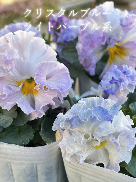 ガルテン湘南さんオリジナル草花の苗/パンジー(フリル咲き):シュガーボンボン(ブルー系)3号ポット 3株セットペチュニア ヴェルデシリーズで有名なガルテン湘南さんのオリジナルフリルパンジー!魅力的な花色とフリルの巻き具合がとってもすてきです。湘南のさわやかな風や海、空をイメージしたクリアな色合いが特徴です。また、ふわふわフリルの入った花弁はパーマヘアの少女や子犬のような柔らかな印象を与えてくれます。生育が緩やかなため、春先暖かくなってきてからも株が伸びにくいので長期間お楽しみいただけます。シュガーボンボンは、柔らかなパステル調のシリーズです。※写真は一例です。株ごとに花色、花形、花のサイズ、フリルの入り具合にばらつきがありますので予めご了承ください。タイプスミレ科スミレ属の耐寒性1年草草丈10-20cm開花期11-5月植え付け適期10-5月日照日向用途花壇、鉢植え、ハンギング栽培方法:排水のよい、保水力のある場所を選びます。植え付け前に水をたっぷり与え、根付くまでは適度な湿り気を保ちます。開花中は次々と花を咲かせますので週に1回、液肥を与えてください。葉が紫色になったり、黄ばんで生育が悪い場合は、液肥を11月下旬頃迄に2−3回追肥します。冬は株全体を寒風から保護し、霜から守ってください。 パンジー(フリル咲き):シュガーボンボン(ブルー系)3号ポット 3株セットの栽培ガイド花がらつみパンジー・ビオラの栽培方法パンジー・ビオラのコンテナガーデン