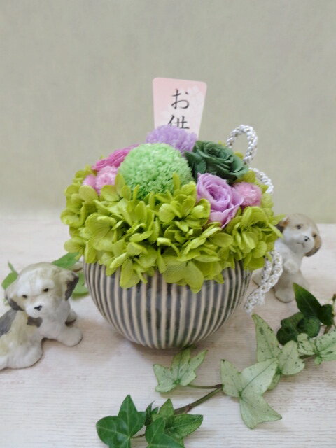 縦縞模様の丸いコロンとしたお洒落な陶器にポンポン菊を使った和風モダンアレンジです。 和風紐リボンも入り、さりげなく可愛いお供えアレンジです。 祭壇に可愛く飾れるサイズ感です。 ペットの祭壇にもおすすめです。 お供え用として、ギフトにの人気です。 ※クリアケースラッピングは、別途110円(税込み)かかります。 使用花材:プリザーブドフラワー (バラ イモーテル アジサイ アイビー) サイズ:10×10 高さ 13センチ プリザーブドフラワーですので水をかけないで下さい。 他のお供えこちらからお供えアレンジ ギフト対応