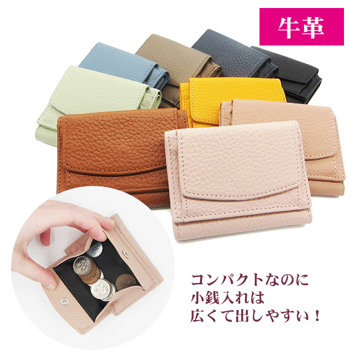 色 天然の皮を使用しているため、使用する部分により商品に個体差があり、色ムラや生態傷、シワなどがある場合がございます。 天然革の特徴としてご理解いただき、風合いをお楽しみください。 モニターの発色具合により実際の商品と色が異なる場合がございますのでご了承ください。 サイズ 横:約9.5cm 高さ:約7.5cm マチ:約2.5cm 重量:本体/約60g 素材 本革(牛革) 原産国 中国コンパクト三つ折り財布コンパクト三つ折り財布 コンパクトなのに小銭入れが広くて出しやすい! おすすめ商品