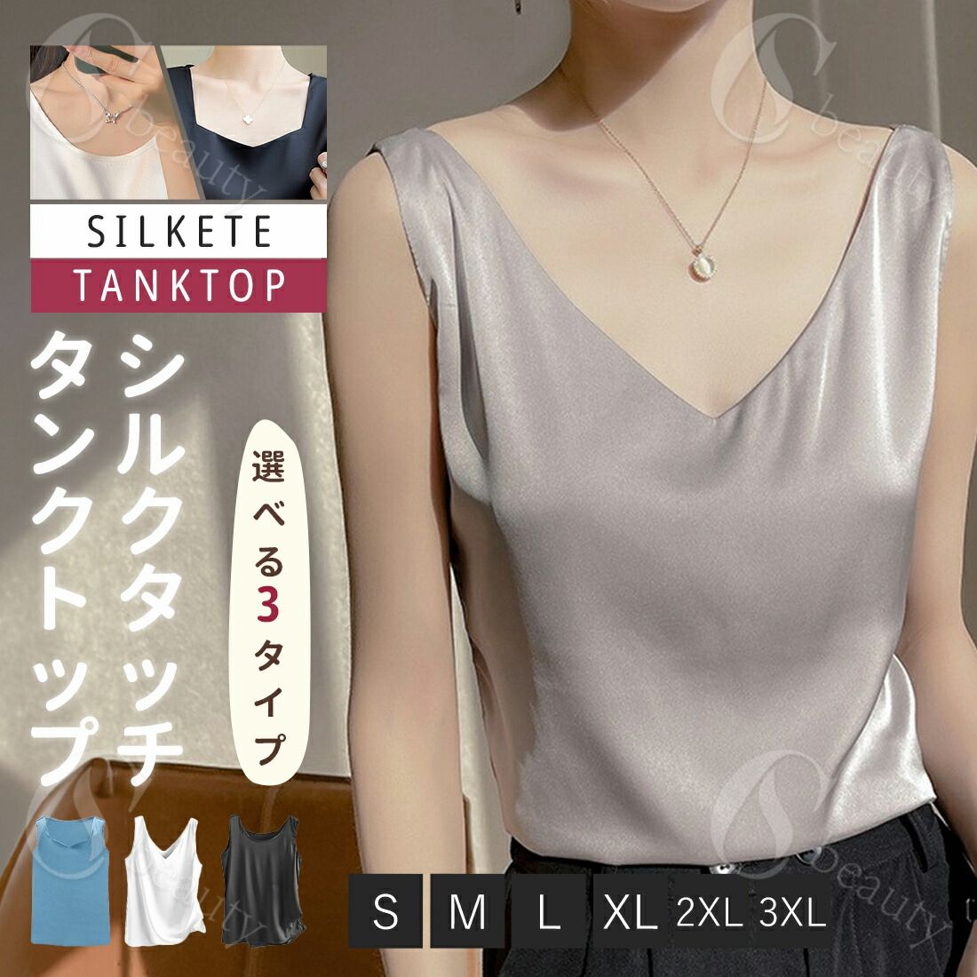 サテンタンクトップ インナー インナーシャツ シルクシャツ レディース 無地 Vネック 上品 高級感 春夏秋 大人カジュアル 通勤用 体型カバー 着痩せ 涼感