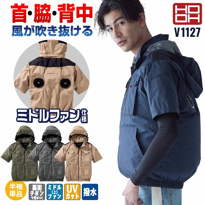 HOOH 空調作業服 ミドルファン フード付 半袖 ブルゾン ジャケット ジャンパー 快適ウェア 空調ウェア 春夏 作業着 涼しい 暑さ対策 熱中症対策 ハイバック フルハーネス対応 裏チタン UVカット メンズ レディース 鳳凰 村上被服 mh-v1127-t