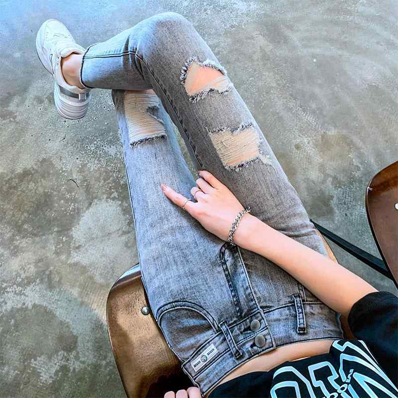 デニムパンツ レディース スキニー ダメージ加工 ストレッチ 伸縮性 美脚 細見え クロップド丈 九分丈 コットン 綿混 ウォッシュ加工 ライトブルー スモーキーグレー 韓国風 春夏 カジュアル 普段使い 着回し