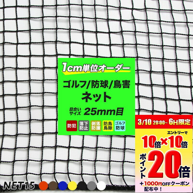 NET15 おすすめポイント 階段の取付に 階段の取付の場合に必要なロープです。商品には付属はしていませんので必要な場合は合わせてご購入下さい。 オススメポイント ★1cm単位でサイズオーダー -------------------------------------------------- ご自宅のスケルトン階段の手すりや螺旋階段などのサイズに合わせてサイズオーダーができます。販売されている一般的な既製サイズでは対応できない場合やきっちりとサイズを決めることができます。 お子様や犬や猫などのペットの階段からの転落防止や物の転落を防止したりと安全対策に大きく役立ちます。 ★7色から選べる -------------------------------------------------- お部屋のインテリアやテイストに合わせて選べるカラー7色をご用意しました。 カッコいいインダストリアルなインテリアや黒をベースにしたインテリアのお家にはブラックが選ばれています。ナチュラルや北欧などにはホワイトが選ばれています。 他にも、イエロー、オレンジ、ブルー、ブラウン、シルバーなどシーンに合わせてコーディネート。 ★日本製 -------------------------------------------------- 国内の工場へご注文をお受けしてからオーダーし、1枚1枚丁寧に制作をさせたいただいております。 安全にかかわるネットだからこそ、品質にもこだわっております。 ★多様な用途で使えるネット -------------------------------------------------- 階段の転落防止用のネットのみならず、ベランダの鳥よけネットや営業後の防犯ネット、ゴルフや野球などの防球ネット、工場の間仕切りネット、集合住宅のゴミネットなど用途は多様です。 室内はもちろん屋外にも使用できるネットです。 商品詳細 ■材質 ポリエチレン ■網目 [タイプ]角目 [大きさ]25mm目(イエローのみ26mm目) [結節]無結節 ■糸 ブラウン[規格]440T(400D)/36本 [太さ]約1.8mmΦ [材質]ポリエチレン ブラック[規格]220T(200d)/80本 [太さ]約1.8mmΦ [材質]ポリエチレン ホワイト[規格]440T(400d)/40本 [太さ]約1.8mmΦ [材質]ポリエチレン ■重量 162g/m2 ■周囲仕上げ 4φポリエチレンロープ(同色)ミシン加工 商品に関するご注意 ■表記のサイズは平置きのサイズです ■サイズの指定は1cm単位にてお受けしております。mm単位での指定はできません。 ■使用用途によって必要な強度と網目の大きさは異なります。目的に合わせて最適なスペックをお選びください。 ■階段などに巻き付けるロープは付属しておりません。必要な場合は合わせてご注文ください。【かがりロープ】 ■法人様からのご注文もお受けしております。 ■1辺が5m以上のものは納期がかかる場合がございます。お急ぎの場合はご注文前にご確認ください ご注文に関するご注意 ■オーダー商品のためご注文確定後の返品・交換はできませんので予め、確認の上ご購入ください。 ■パソコンの環境により、モニター画面上の色と実際の商品の色の見え方が異なる場合がございます。 ■ご注文後の返品・交換・キャンセルのできない商品です。開封した商品の返品・交換は一切お受けできません。 ■出荷完了後の変更については、交換対応となり、料金が必要となりますので、事前にご確認をいただいた上でのご注文をお願いいたします。 ■ご注文の前に当店のご注文規定を必ずご確認ください。ご注文の際は、こちらのページの内容をご理解いただいたものと判断させていただきます。