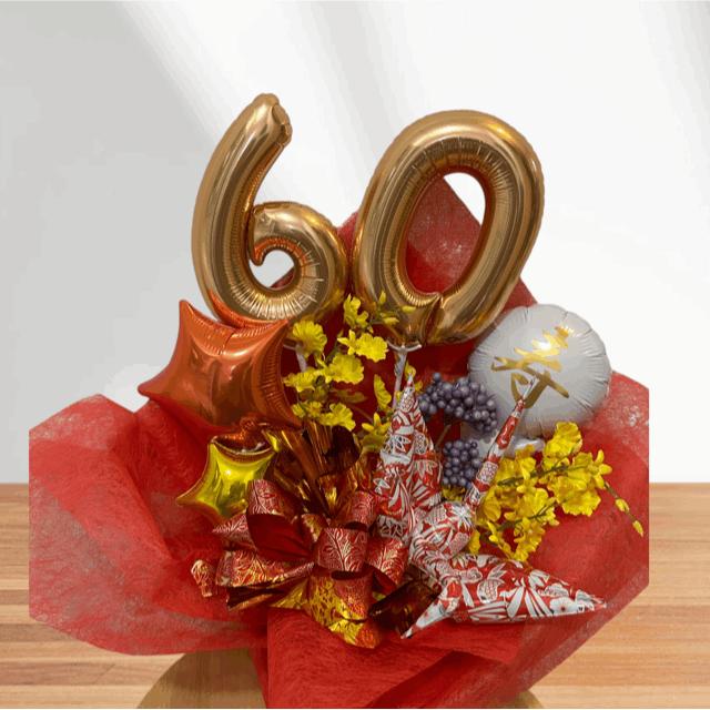 還暦お祝バルーンギフト a5000還暦お祝バルーンアレンジは、特別な日を華やかに彩るギフトです。数字のバルーンと造花が組み合わさり、長持ちするため手間いらず。人気のオリズルバルーンが「寿」を象徴し、喜びを演出します。コンパクトで卓上にぴったりのサイズ感が魅力。オプションでお名前印字も可能なので、心のこもった贈り物として最適です。還暦やご長寿のお祝いに、特別な思いを込めたバルーンギフトをどうぞ。商品サイズH45Cm W40CM 無料のギフトラッピング(セロファン・リボン)をお付けしてのお届けとなります人気のオリズルバルーン星形オレンジバルーンへお名前印字8文字まででお受けさせいただきます 別途200円