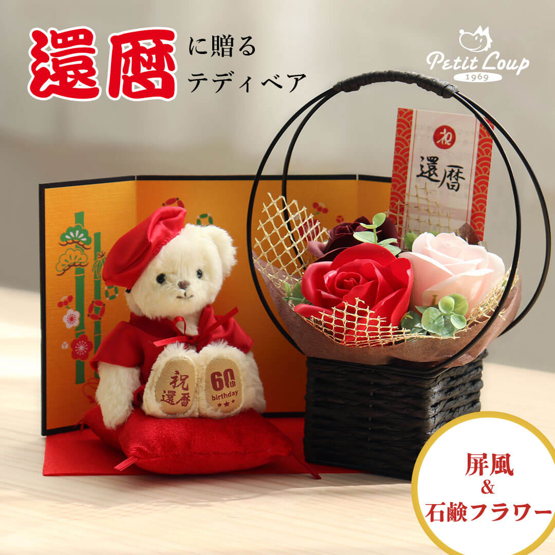 《小サイズ》還暦祝いベア フレグランスソープフラワー 金屏風付き [名前刺繍幕・記念日刺繍可] 還暦お祝い 華やか 花 くま バラ 花 女性 男性 母の日 父の日 敬老の日 プレゼント お誕生日 ギフト 60歳 赤ちゃんちゃんこ