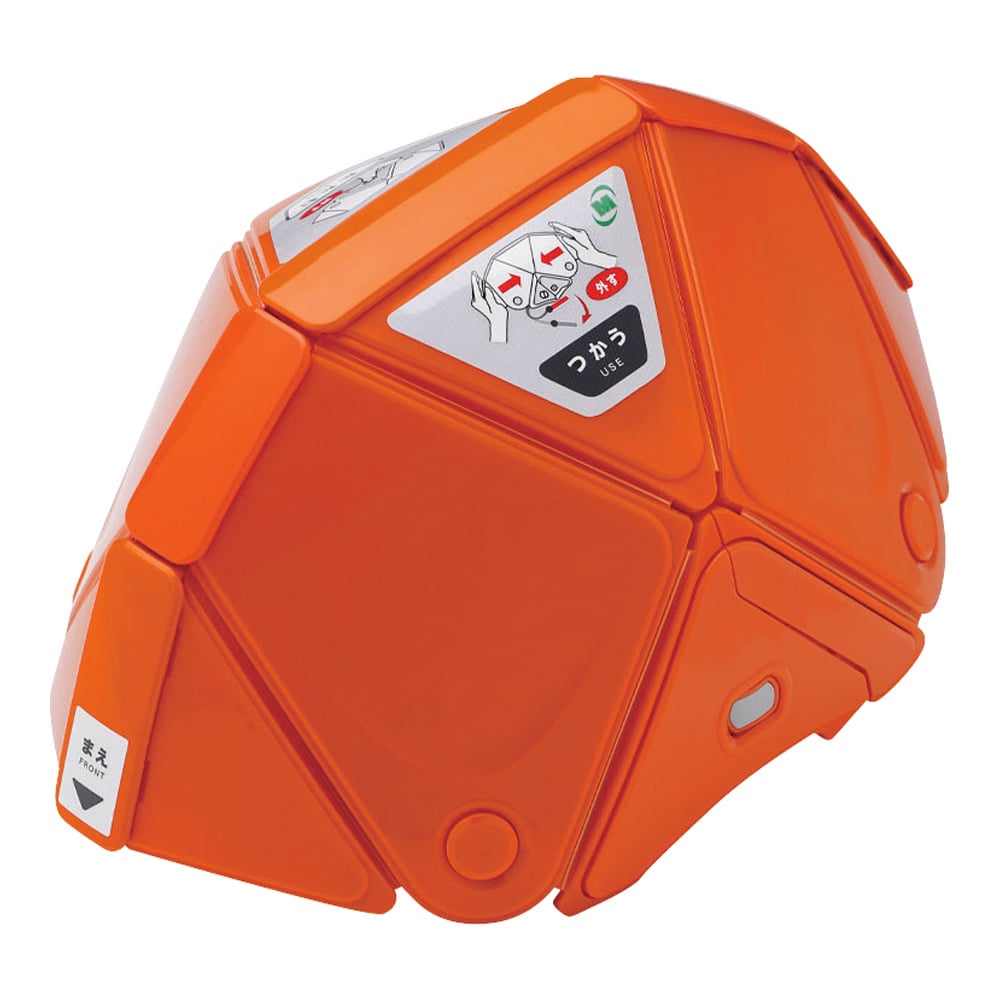 性能 仕様・規格 タイプ:防災用ヘルメット、工事用ヘルメット 寸法(mm):[装着時]208×278×140、[収納時]208×278×80 頭周囲(cm):47〜62(フレキシブルヘッドバンド搭載) 重量(g):420 パッケージ(mm):214×84×287、ヘッダー高さ:30 付属物:不織布製収納袋 材質 ABS樹脂折りたたみ薄型の本格仕様!防災用の備蓄に最適。出張や電車移動にも 持ち運びを考えた薄型設計にも関わらず「飛来・落下物用」と「墜落時保護用」の検定を取得した「プロが現場で使えるヘルメット」。収納に便利なA4サイズのパッケージ入りで、備蓄用として本棚や引き出しの保管に便利です。 POINT1 携帯しやすい極薄設計。2分の1の高さで収納 帽体の上半分をくるっと回転させるだけで、ヘルメットが約半分の高さになるため、ビジネスバックにも収納できます。出張や現場間の移動時にも邪魔にならず持ち運べます POINT2 本棚に収容できるA4サイズ 箱に入れたまま本棚や引き出しに収納できます。スタッキング性に優れているので、防災用ヘルメットの保管場所に悩むことはありません POINT3 作業現場でかぶれる安全性と被り心地 回転式ヘルメットでありながら、作業用としてかぶることを 想定しているため、被り心地の良さにもこだわりました。 墜落時保護用の検定を取得しているので、従来のヘルメットと同じように現場で使用できます。そして移動時は折りたたんで収納 POINT4 子どもから大人までサイズ対応 頭周囲47〜62cmに対応する「フレキシブルヘッドバンド」を採用。子供から大人サイズまでしっかり対応します。標準設定:53〜62cm、小サイズ設定:47〜56cm。出荷時には頭囲サイズ53〜62cmに設定しています 組み立て、折りたたみは回すだけ 組み立て方 折りたたみ方 装着時のチェックポイント 3種類のカラーから選べます オレンジ ホワイト ブルー ヘルメットへの印刷も忘れずに! ※当ヘルメットは印刷出来る個所が狭いため、印刷のデザインによっては印刷が出来ない場合がございます。ご了承ください(詳しくは別途お問い合わせください)。 規格について 作業用ヘルメットには厚生労働省の定める「保護帽」の規格があり、保護帽の着用が規定された作業範囲が定められております。保護帽は使用区分によって、構造・機能が異なります。作業内容にあった適切な保護帽をお選びください。 ***飛来・落下物用/墜落時保護用/電気用 帽体、着装体、衝撃吸収ライナー及びあごひもをもつもので、帽体が充電部にふれた場合に感電から頭部を保護できる構造をもち、飛来物又は落下物による危険及び墜落による危険を防止又は軽減し、頭部感電による危険を防止する機能を持つヘルメットをいいます。 ABS樹脂とは Acrylonitrile Butadiene Styrene(アクリロニトリル・ブタジエン・スチレン)。合成樹脂の一種で、剛性、硬度、加工性、耐衝撃性、曲げ疲労性などの特長があります。さらに電気絶縁特性に優れているが、耐熱性はやや弱く、高熱作業環境には不向きです。ABS樹脂ヘルメットの耐用年数は3年以内。異常が認められなくても買い替えを。※ベンチレーションや通気孔、バイザー等の取付穴のあるヘルメットは電気作業に使用できません