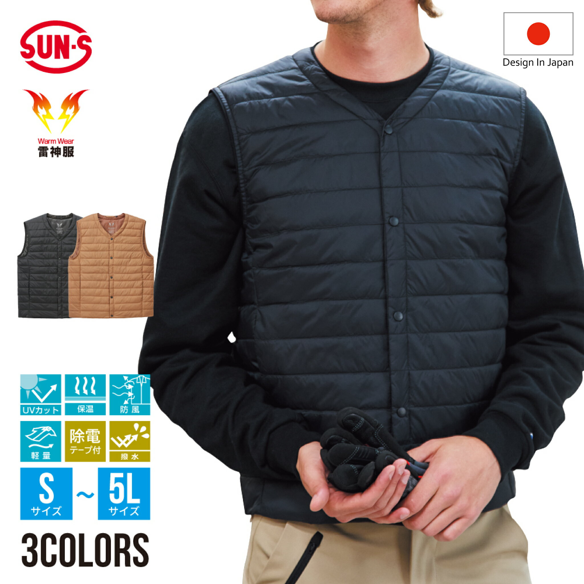 《ブランド紹介》雷神服電気の力で即座にウェア内部から温める冬のワークウェアの鉄板的シリーズ。体に密着し保温性も抜群。日本メーカーの電熱防寒服。過酷な冬の現場を耐え抜く頼もしき相棒。《商品説明》雷神服史上最も軽いインナーベスト!冷たい風を完全にブロックし、暖かい空気を逃さない五層構造仕様。《素材/カラー展開/サイズ》表:ナイロンタフタ/ナイロン100%(シレー加工)裏:ポリエステルタフタ/ポリエステル100%(シレー加工)中綿:ポリエステル100%カラー:ネイビー、ブラック、モカムースサイズ:S、M、L、LL、3L、4L、5L《仕様説明》背中部分に発熱ユニットを2枚装着できるため、寒い日でも一日中暖かさをキープできます。また、衣類などにたまった静電気を逃し、冬場のイヤなバチバチを防ぐ除電テープ付きです。出し入れしやすく、収納力もたっぷりな両脇ポケットや、ケーブルをスッキリまとめることができるケーブルループで、ウェア内のごちゃごちゃを解消します。※バッテリーは右脇ポケットに収納可能です。冷たい風を通さない五層構造仕様となっており、ウェア内の暖かさを守ることができます。《使用可能バッテリーについて》発熱ユニット(RD9570)をご使用の場合は、以下のバッテリーをご使用ください。【24V仕様:リチウムイオンバッテリー】・RD9590 ・RD9490 ・RD9390 ・RD9580G【12V仕様:リチウムイオンバッテリー】・RD9291 ・RD9290 ・RD9190【出力2A:モバイルバッテリー】・RD9243 ・RD9241※上記バッテリー、もしくは出力2A以上のモバイルバッテリーをご使用ください。※ただし、全てのバッテリーとの動作を保証するものではありません。《商品備考》※送料無料対象商品※サイズ交換可能商品(1回のみ)配送時間指定対応可能※発熱ユニット及びバッテリーは別売になります。上記の【使用可能バッテリーについて】よりお求めください。※モデル画像は環境光の影響によりカラーが実物と異なって見える場合がございます。平置きのカラー画像を御参考ください。※サイズは平置き、メジャー採寸のため多少誤差が生じる場合がございます。 サンエス 雷神服Ⓡ インナーベスト UVカット 保温 防風 軽量 撥水 光吸収発熱 水洗い可能 除電テープ付 ネイビー ブラック モカムース 男女兼用 秋 冬 寒さ対策 冬対策 スポーティ スポーツ アウトドア ジョギング ウォーキング キャンプ ワーク ワーキング 作業服 現場 運送 作業 通勤 通学 電車 自転車 バッテリー・発熱ユニット別売り 日本メーカー