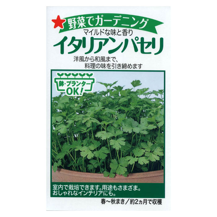 苗木部の配送料金についてこちらの商品の送料区分は・・・ネコポスです。 ※送料は購入手続きにて配送先住所を指定した際に表示されます。※離島・一部地域は追加送料がかかる場合があります。送料についてはこちらお届けする商品について商品についてイタリアンパセリの種。【内容量: 1ml】遺伝子組み換えの種ではありません。◆種という性質柄入荷ロットにより生産地が異なり、1アイテムでも生産地が3~4生産地になることがあり、明言化できません。※商品裏面には記載されております。◆内容粒数は生産地と同様入荷ロットにより異なるためこちらに関しても明言できません。◆メーカー在庫のお取り寄せとなります。◆種子は発芽試験を受けた純良なものをご用意させていただきますが、播種後、温度や水分などが不適な条件下では発芽しない場合があります。◆種子のパッケージはデザインの変更などにより写真と異なる場合があります。また、詳しい育て方はパッケージ裏面にあるQRコードからご確認ください。◆発送時期よって種子の有効期限が間近な商品となる場合があります。種まき時期に考慮した出荷はできません。種の有効期限について野菜の種には有効期限があります。有効期限とは種を正しく保存したときに発芽を維持できる期間です。種苗法により、発芽試験から1年間(気密包装の場合は、2年間)と定められています。4~5月と10~11月に発芽試験を行います。有効期限を過ぎた場合でも発芽しないということではありません。また、有効期限切れの種から育てた作物が食べられないことでもありません。とはいえ、種にも寿命がありネギや玉ねぎ、落花生、シソなどの種の寿命が短い作物で1~2年、大根、キャベツ、白菜、レタス、ほうれん草、ニンジン、ゴボウ、エンドウ、インゲン、ソラマメ、三つ葉などで2~4年、ナスやトマト、キュウリ、かぼちゃ、すいか、唐辛子などの長命種子では4年以上の寿命があります。種の保存方法について種は高温・多湿を嫌います。常温のままで保存してしまうと、種が劣化して発芽率が落ちてしまいます。発芽力を長く維持するためには、低温・低湿の環境である冷蔵庫がおすすめです。ジップロックなどの密封された袋または、茶筒・海苔缶へ種袋と一緒に乾燥剤を入れてから密封して保存してください。Petroselinum crispum var. neapolitanum種|イタリアンパセリ 1mlイタリア料理に最適!マイルドな香りイタリア料理には欠かせないハーブならコレ!菜園はもちろんプランターや鉢でも育てることができます。 パセリにはビタミンやミネラルが豊富に含まれています。サラダやスープ、パスタに混ぜたり、お料理の彩りに添えられたりと、料理にアクセントを、という時に役に立つハーブです。 パセリは春と秋が播種期(はしゅき)で2年草になります。トマトとアスパラガスとパセリはコンパニオンプランツのハッピートリオといわれ、混植するとニンジンとタマネギの根を害虫から守ります。「パセリ」は古代ローマ時代から料理に用いられており、世界で最も利用されているハーブです。パセリはカールした葉が特徴的なカールパセリとミツバのような葉を持ったイタリアンパセリがあります。一口にパセリというと、カールパセリを指します。イタリアンパセリの特徴学名Petroselinum crispum var. neapolitanum セリ科 オランダゼリ属別名オランダゼリ、パセリプレーン、パースリ開花時期6~7月花色・大きさ・花形白色最終樹高地植え:m ~ 0.4m 鉢植え:m ~ 0.4m (常緑二年草)栽培用途鉢植え、庭植え、寄せ植え、グランドカバー、ボーダー、花壇、切り花など成長の早さ早い (40cm/年)植栽適地関東~沖縄(鉢植えでなら全国で栽培可能)育てやすさ ★★★★☆ 初心者におすすめ日照条件:日なた~半日陰、土壌酸度:弱酸性耐寒性普通、耐暑性やや強い耐病害虫性耐病性:やや強い 害虫:ほとんど出ない花言葉勝利、祝祭、愉快
