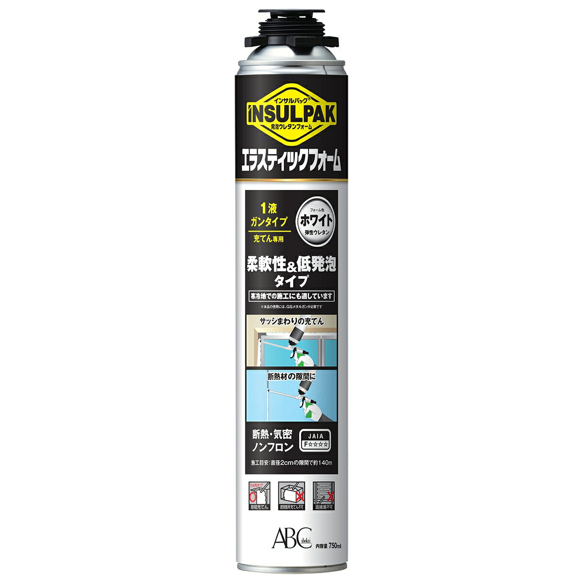 特長●弾性ウレタンフォーム従来の1液タイプのウレタンフォームと違い柔らかいため、木製サッシや樹脂製サッシなど素材の動きに追従し、耐久性を大幅にアップしました。細かい隙間を埋めたり、少量のはみ出しなら柔軟性を生かしてカットなしで押さえつけて施工が可能です。●気密性の高いフォームで施工時間も短縮し効率化一般的に窓サッシの断熱に使われるグラスウールと比較し、エラスティックフォームは一度に施工が可能で、時間を大きく短縮することができます。●カットの手間と無駄なゴミも軽減低発泡でふくらみが少ないため、カットの手間を軽減。発泡圧によりサッシを歪ませる心配も少ないです。少量のはみ出しならそのままボードに貼れるため、ゴミの量も軽減します。●硬化が早く、寒冷地でも施工可能通常の1液タイプのウレタンフォームに比べて硬化が早く、スピーディーな作業を実現しました。また、-5℃でも施工が可能なため、寒冷地での施工に適しています。●すぐれた断熱・気密効果発泡ウレタンは、断熱性能を有して、しっかり隙間を埋めることができるので、断熱・気密処理に最適です。●環境配慮環境に配慮しノンフロンとなっています。また、F☆☆☆☆も取得しています。使用用途●断熱材の隙間充てん●部材間の隙間や貫通部の埋め戻し●サッシ廻りの結露防止●建築金物のシール●柱部の断熱不向きな施工箇所■大容量の施工(1回の充てん最大5cm角の隙間まで)■密閉箇所への充てん空気中の湿気と反応し硬化するので空気に触れない箇所では硬化不良を起こします。■平面への施工硬化までに1〜2時間かかるため多量に施工すると垂れ落ちてしまいます。検索キーワード:DIY 充てん材 補修 断熱 気密 補修 防結 密閉 INSULPAK 1液ガンタイプ エービーシー商会