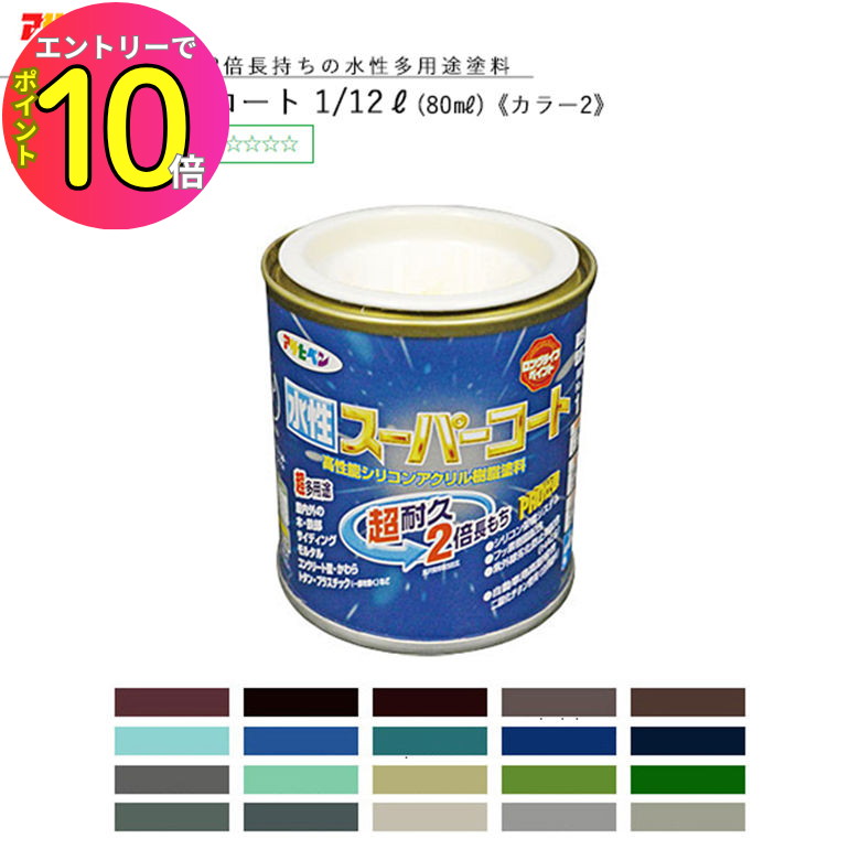 [エントリーでP+5倍] 水性スーパーコート 1/12L(80ml) 全45色中20色《カラー2》 水性塗料 リフォーム リメイク 補修 壁 外壁 ペンキ 屋外 壁紙 家 天井 塗装 塗料 室内壁塗料 ペイント 塗装用品 デコレーション デコ 自宅 修復 アサヒペン | diy 水性 屋内 コンクリート