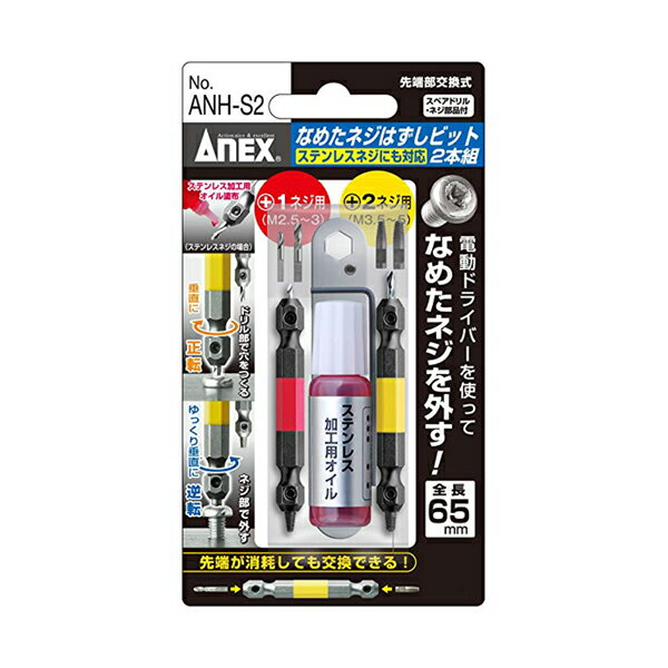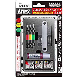 ●メーカー名:アネックス / ANEX●商品名:ANH-S3 なめたネジ外しビット ステンレスネジ対応 3本組(M2.5-M3、M3.5-M5、M6-M8)●メーカー品番:ANH-S3●JANコード:4962485361730商品の保証は、メーカー保証書の内容に準じます。●セット内容ステンレス加工用オイル、スペアドリル1.5mm/2mm/3mm、スペアネジ部品NO.1/NO.2用、専用レンチ、専用スパナ、固定用ネジ(各1個)●仕様全長(mm):65対応サイズ:(#)1、(#)2、(#)3なめたネジが間単に外せます。(ドリルで穴があくネジであれば使用可能です。)先端部交換式。ネジ部・ドリル部が折れても交換可能。(M6〜8ビット刃ドリル部のみ交換可能)ステンレスネジ対応。M2.5〜8ネジ用((+)No.1、No.2、No.3相当)●ご注意※熱処理(HRC40以上)したネジは穴あけがむずかしい為、使用で着ません。