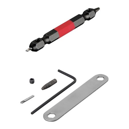 ★特長★ ・ステンレスネジ対応 ・なめたネジが間単に外せます(ドリルで穴があくネジであれば使用可能です) ・ねじ部ドリル部が折れても交換可能(M6〜M8ビットはドリル部のみ対応) ・電動ドライバーを使用 ・M2.5〜8ネジ用(プラスNo.1/No.2/No.3相当) ★注意事項★ ・熱処理(HRC40以上)したネジは穴あけがむずかしい為、使用で着ません ★仕様★ ・全長:65mm ・対応サイズ:No.1/No.2/No.3 ・軸径:六角6.35mm ★セット内容★ ・ステンレス加工用オイル ・スペアドリル:1.5mm ・スペアドリル:2mm ・スペアドリル:3mm ・スペアネジ部品:No.1用 ・スペアネジ部品:No.2用 ・スペアネジ部品:No.3用 ・専用レンチ ・専用スパナ ・固定用ネジ