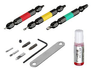【商品説明】 ●セット内容:M2.5~3(+No.1相当)ネジ対応ビット、M3.5~5(+No.2相当)ネジ対応ビット、ステンレス加工用オイル、スペアドリル1.5mm・2mm、スペアネジ部品No.1・No.2用、専用レンチ、専用スパナ、固定用ネジ 『なめたネジを簡単にはずせる』 取れなくなったプラスネジを簡単に外せる ドリル部とネジ部の2つの先端で、ネジ穴をなめてしまい脱着不能になったネジを外せるなめたネジはずしビットシリーズ。 ドリル部でネジに穴をつくり、ネジ部を喰いつかせてなめたネジを外す。 サイズごとに軸がカラーリングされており簡単にサイズの見分けがつく。 消耗したり、欠けてしまったドリル部やネジ部は、付属のスペアや別売の専用スペアドリル・ネジ部品に交換すればビットを繰り返し使うことができる(M6~8ネジ用はドリル部のみ交換可能)。 付属のステンレス加工用オイルでステンレスネジにも対応。
