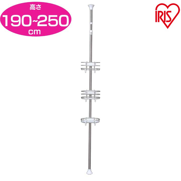 ※注文確定時に時間指定のプルダウンが出てくる場合がございますが、設置込み商品ご注文の場合は時間指定できかねますので、予めご了承ください。 浴室収納の不満を解消するバス用品をスッキリ収納できる突っ張りラックです♪サビに強いオールステンレス製です。ワイヤー仕様で水はけが良く衛生的なかご付きです!かごの高さを調節可能、タオルやスポンジを掛けるのに便利なフック付きです。石鹸等を置くのに便利な小物置きマット付きです。天井から床に突っ張れるサイズです。●商品サイズ(cm)【本体】幅約22×奥行約17.8×高さ約190〜250※ヘッダー含まず(ヘッダー高50mm)【かご内寸】深型:幅約20.8×奥行約10.2×高さ約8.5浅型:幅約20.8×奥行約10.2×高さ約2.8●重量(kg)2.3●かご深型×2個、浅型×1個●フック6個●耐荷重量全体:10kgfかご(深型):3kgfかご(浅型):1kgfフック:0.5kgf●材質ポール:ステンレス樹脂部:ABS、PP、ポリプロピレンかご:ステンレス◇◆こちらもおススメ◆◇ ・ステンレスワイヤーバスケット ミドル アイリスオーヤマ ・ステンレスワイヤーバスケット ワイド アイリスオーヤマ ・ステンレスワイヤーバスケット 浅型 アイリスオーヤマ ・浴室突張りラック BLT-19 アイリスオーヤマ ・浴室突張りラック BLT-25 アイリスオーヤマ ・ステンレス浴室突張りラック BLT-19S アイリスオーヤマ ・ステンレス浴室突張りラック BLT-25S アイリスオーヤマ ・メタルラックキャスター ストッパー無 アイリスオーヤマ ・メタルラックキャスター ストッパー付 アイリスオーヤマ ・メタルラック大型キャスター ストッパー無 アイリスオーヤマ ・メタルラック大型キャスター ストッパー付 アイリスオーヤマ 最強翌日配送対象商品に関するご案内 最強翌日配送対象商品・対象地域に該当する場合は最強翌日配送マークがご注文カゴ近くに表示されます。 最強翌日配送可能なお支払方法は【クレジットカード、代金引換、全額ポイント支払い】のみとなります。 下記の場合は最強翌日配送対象外となります。 ・15点以上ご購入いただいた場合 ・時間指定がある場合 ・ご注文時備考欄にご記入がある場合 ・決済処理にお時間を頂戴する場合 ・郵便番号や住所に誤りがある場合 ・最強翌日配送対象外の商品とご一緒にご注文いただいた場合 ・お届け先住所文字数が40文字以上の場合ご注文前のよくある質問についてご確認下さい[ FAQ ]