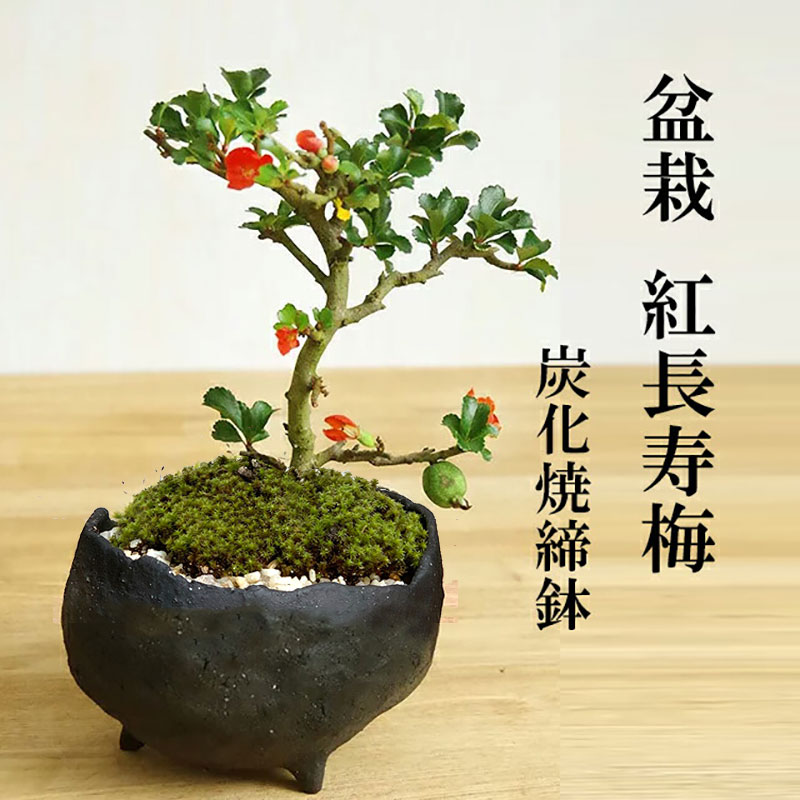 盆栽 現在葉姿 紅長寿梅 鉢 真山茜 炭化焼締鉢 bonsai 長寿梅 紅花 花咲く盆栽 縁起良い ギフト初心者 初めての盆栽 誕生日 新入学 新築祝い 育てやすい 四季咲き 縁起物 還暦祝い 結婚祝い ぼんさい ボンサイ