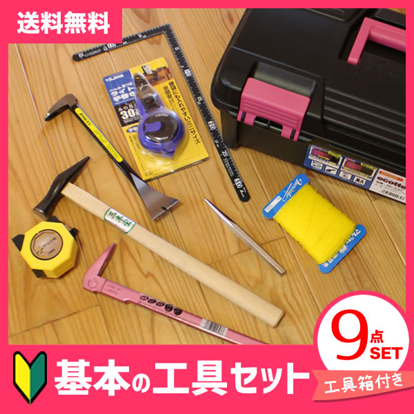 基本の工具セット9点セット(ケース付き)羽目板施工・DIY入門用 ・金槌・差金・メジャー・ポンチ・バール2種・ポンチ・墨つぼ・測量糸