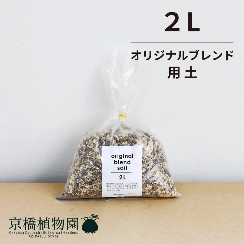 お届け内容 品名 オリジナルブレンド用土 (観葉植物・多肉植物用) 内容量 2L (目安:5号鉢~6号鉢) 特徴 小粒の赤玉土、硬質の鹿沼土に加え、養分を含んだ培養土をミックスしたオリジナル配合の用土です。 根腐れ予防になるよう排水性を良くしており、適度に水持ちもします。硬質の鹿沼土で粒が崩れにくく、排水性が長持ちします。 ※複数個お求めの場合、植物と一緒にお買い求めいただいた場合は、送料を変更しております。 ※店舗の在庫状況によっては、ご希望の日時でのお届けがかなわない場合がございます。お急ぎの場合は、お電話にて在庫をご確認ください。