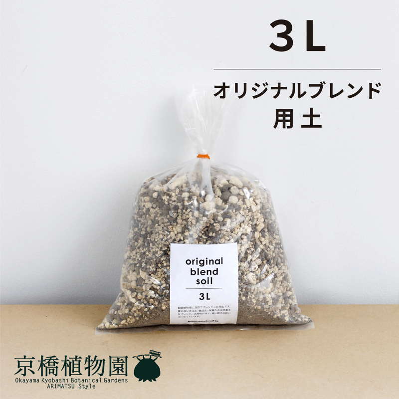 お届け内容 品名 オリジナルブレンド用土 (観葉植物・多肉植物用) 内容量 3L (目安:7号鉢) 特徴 小粒の赤玉土、硬質の鹿沼土に加え、養分を含んだ培養土をミックスしたオリジナル配合の用土です。 根腐れ予防になるよう排水性を良くしており、適度に水持ちもします。硬質の鹿沼土で粒が崩れにくく、排水性が長持ちします。 ※複数個お求めの場合、植物と一緒にお買い求めいただいた場合は、送料を変更しております。 ※店舗の在庫状況によっては、ご希望の日時でのお届けがかなわない場合がございます。お急ぎの場合は、お電話にて在庫をご確認ください。