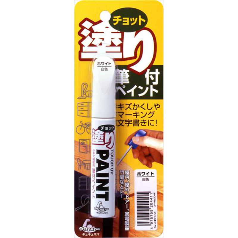 チョットしたキズ隠し、マーキング、文字書き、サビ防止に最適です。 99PAPA ちょっと塗りペイント ホワイト 4975759204411 ドアや屋外門扉、家電製品等のキズ隠し・マーキング・文字書き等。 ■特徴 ・小キズ補修用筆付ペイントです。 ・ちょっとしたキズかくしやマーキングに最適です。 ・鉄用、屋外木用、屋内木用(床を除く)です。 ・別売りのエアーブラシキットを使えば、スプレー塗装で更にキレイにキズを直せます。 ■仕様 ・内容量:12ml。 ・塗り面積:0.08m2。 ・色:ホワイト。 ・重量 : 0.032kg ・パッケージ寸法 : 67×20×177mm ・パッケージ重量 : 32g ■材質 ・合成樹脂。 ・有機溶剤。 ・顔料・ニトロセルロース。 ※改良により予告なく形状や仕様が変更になる場合があります。ご了承ください。