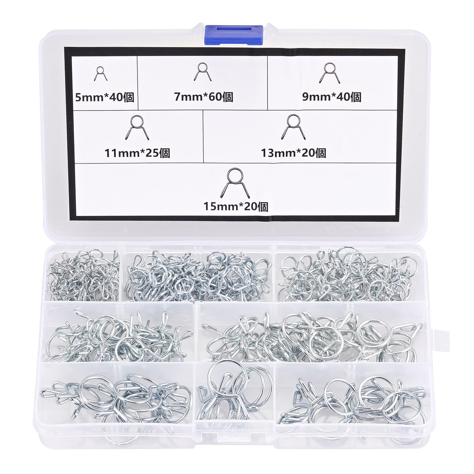 商品情報商品の説明【サイズ】Φ5mm*40個、Φ7mm*60個、Φ9mm*40個、Φ11mm*20個、Φ13mm*20個、Φ15mm*20個。全6種類ご用意しています。使用範囲: 5~7.1、 7~9.1、 9~11.1、11~13.1、13~15.1、 15~17.1。 【材質】製品は、表面が細かく亜鉛メッキされたばね鋼でできています。ばね鋼の剛性と靭性を維持し、ホースをより強力に固定します。そしてそれは優れた防錆性を持っています。防水、耐腐食性、耐久性に優れています。安心に使用できます。 【応用】パイプ、ケーブル、チューブ、自動車燃料ライン、フューエル/ガソリンホース、水道ホース、エアーホースチューブ、シリコン真空ホースなどのホース、燃料ラインなどの固定に使用されます。個人用、自動車、産業、機械、家庭用などの屋内または屋外での使用に最適です。 【持ち運びが容易】丈夫な収納ケースが付き、シンプルな組み立てで、簡単にお客様が必要とするサイズを取得します。携帯も保管にもとても便利です。 【サービス】ご不明な点がございましたら、お気軽にお問い合わせください、30日以内に返品または返品保証を提供します。主な仕様 【サイズ】Φ5mm*40個、Φ7mm*60個、Φ9mm*40個、Φ11mm*20個、Φ13mm*20個、Φ15mm*20個。全6種類ご用意しています。使用範囲: 5〜7.1、 7〜9.1、 9〜11.1、11〜13.1、13〜15.1、 15〜17.1。br【材質】製品は、表面が細かく亜鉛メッキされたばね鋼でできています。ばね鋼の剛性と靭性を維持し、ホースをより強力に固定します。そしてそれは優れた防錆性を持っています。防水、耐腐食性、耐久性に優れています。安心に使用できます。br【応用】パイプ、ケーブル、チューブ、自動車燃料ライン、フューエル/ガソリンホース、水道ホース、エアーホースチューブ、シリコン真空ホースなどのホース、燃料ラインなどの固定に使用されます。個人用、自動車、産業、機械、家庭用などの屋内または屋外での使用に最適です。br【持ち運びが容易】丈夫な収納ケースが付き、シンプルな組み立てで、簡単にお客様が必要とするサイズを取得します。携帯も保管にもとても便利です。br【サービス】ご不明な点がございましたら、お気軽にお問い合わせください、30日以内に返品または返品保証を提供します。