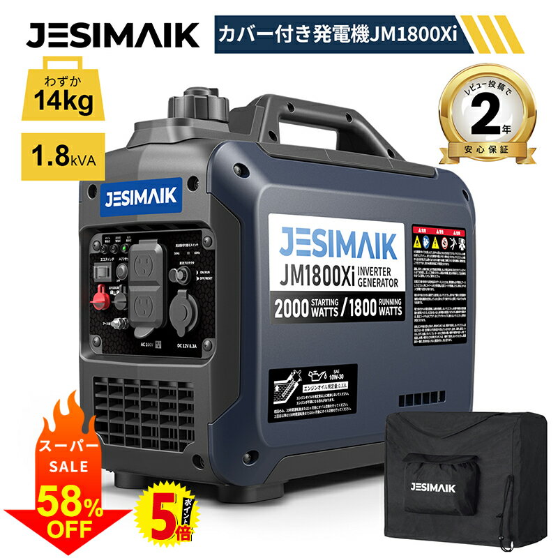 スーパーSALE!58%OFF+P5倍【業界超軽量14kg】 JESIMAIK カバー付 発電機 小型 家庭用 JM1800Xi 発電機 インバーター 静音 キャンプ 小型発電機 最大出力2000W 並列運転 コンパクト ガソリン発電機 防災 純正弦波 低騒音 非常電源 キッチンカー 激安
