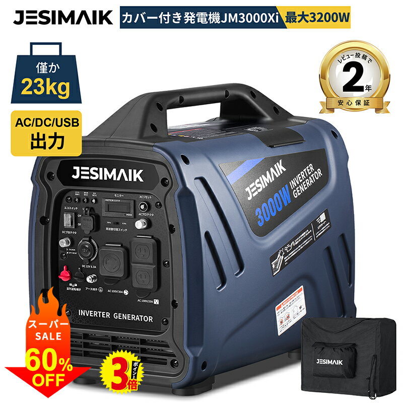 【スーパーSALE!60%OFF+P3倍】 JESIMAIK カバー付き 発電機 インバーター JM3000Xi AC/DC/USB3つの出力対応 発電機 小型 家庭用 3000W ガソリン発電機 軽量 モニター付き 低騒音 正弦波 イベント キッチンカー 農業用 水中ポンプ電源 防災対策 地震 非常用