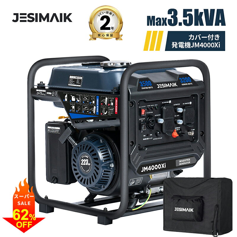 【スーパーSALE!年間最安値62%OFF+P3倍】 JESIMAIK カバー付き 発電機 小型 ガソリン 3200W 高出力 発電機 インバーター JM4000Xi インバータ発電機 家庭用 エンジン発電機 防災 軽量 防災 地震 台風 非常用電源 正弦波 移動販売 キッチンカー 災害 停電 業務用 工事