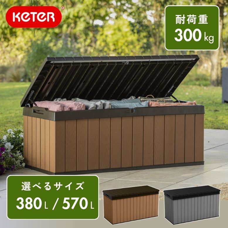 ■商品名 【小型物置 / 収納庫】 ケター ダーウィン ボックス 380L・570L KETER Darwin box 100G wood brown KETER Darwin box 150G wood brown ■380Lサイズ ・外寸 約 横幅142.5x奥行65.3×高さ54.5cm ・内寸 約 横幅132.2x奥行55.7×高さ47.4cm ■570Lサイズ ・外寸 約 横幅143x奥行66×高さ78cm ・内寸 約 横幅133x奥行56×高さ72cm ■梱包サイズ 380L:約 横幅148×奥行71×高さ15cm【240サイズ】 570L:約 横幅148×奥行69×高さ18.6cm【240サイズ】 ■カラー ・ウッドブラウン ・グレー ※380Lのみ ■容量 ・約 380L ・約 570L ■重量 380L:約 17kg 570L:約 21kg ■耐荷重 ・フタの耐荷重:約 300kg ・収納部耐荷重:約 75kg ■材質 ポリプロピレン・スチール・アルミニウム ■形式 組立式 ■備考 ・UV加工あり ・油圧ダンパー付き ・組立必要/説明書図解(英語表記) ・施錠可能なカギ取付穴あり (南京錠はお客様でご用意ください) ・輸入商品特有の製造上のキズや塗装剥がれ等、また輸送時のパッケージへのダメージが見受けられる場合がございます。予めご了承ください。 ■注意 ※収納庫・物置に関しましては、完全防水仕様ではございません。隙間から雨水が入る場合もございます。あらかじめご了承ください。 ■納期 当店の在庫は、店舗と共有しており日々流動的に動いております。 ご注文のタイミングにより在庫欠品中の場合がございます。 在庫欠品時は次回入荷予定日を確認の上、ご連絡させていただきます。 その上でお待ちいただく、もしくはキャンセルのどちらかをご選択下さいませ。