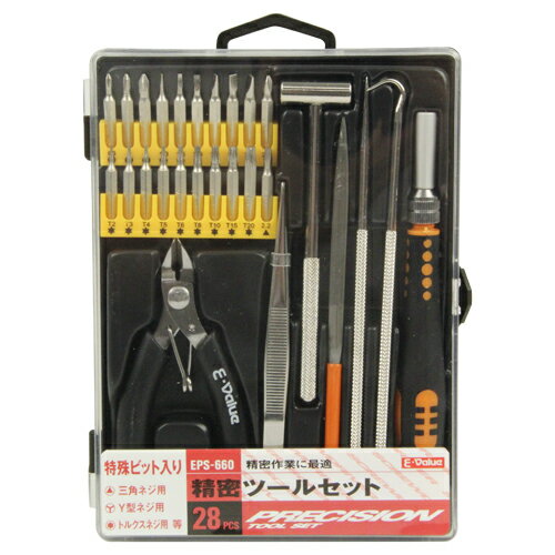 ■商品名 精密ツールセット ■ブランド名 E-Value ■規格 EPS-660 ■用途 時計、メガネ、精密機器の修理・組立などの精密作業。 ■機能・特徴 ミニニッパは、プラスチック・軟線の切断に使用できます。 ピックツールは、細かな部品の着脱・調整に最適です。 28ピース入り。 ■セット内容 マスターハンドル エクステンションホルダー ミニニッパ ピンセット ミニハンマー ミニヤスリ 半丸 ピックツール:ストレート型, フック型 マイナスビット:-1.0, -1.5, -2.0, -2.5, -3.0, -3.5 プラスビット:+00(2.0mm), +0(2.5mm), +1(3.5mm) トルクスビット:T2, T3, T4, T5, T6, T8, T10, T15, T20 特殊ビット:三角2.2mm, Y型2.6mm ■注意事項 製品本来の用途以外には使用しないでください。 説明書、商品パッケージ等に記載されている内容を十分にご確認頂き、正しく安全にご使用ください。