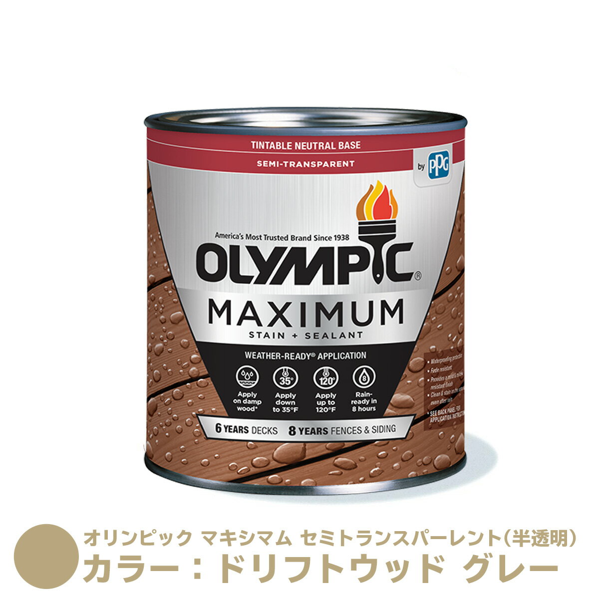 オリンピック マキシマム セミトランスパーレント(半透明)カラー:ドリフトウッド グレー 容量:3.78L【全48色】 水性 木材用 塗料 屋外用 フェンス ウッドデッキ リフォーム ラティス 木柵 ドア ベンチ 塗装 DIY 木部 保護 防腐 防水 防カビ PPG ステイン 【送料無料】