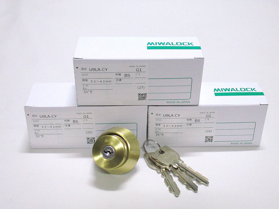 ミワロックLA(レバーハンドル)、DA(本締錠)用のスタンダードタイプの取替用シリンダーです。色は金色で、子鍵は3本ついています (更に追加のコピーキーがご入用の場合はこちらへお願いいたします)。取替えの元となるLA,DAの仕様につきましては、U9DA-1取替用本体セット及びU9LA取替用本体セットのページをご覧になって下さい。扉の厚みは33ミリ以上42ミリ未満のものに対応しております。 お得な3個セット商品はこちらです。 ⇒ DA,LAシリンダー交換説明書はこちら