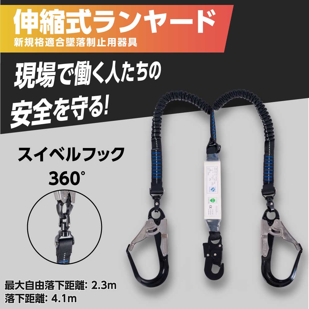 ★60%OFFクーポン配布中★【新規格 適合品】 墜落制止用器具 ランヤード ツインタイプ フルハーネス型 巻取り式 伸縮式ランヤード 使用可能な質量 100kg 作業性 安全性 高所安全作業 電気工事 登山 ツリークライミング ef-m013