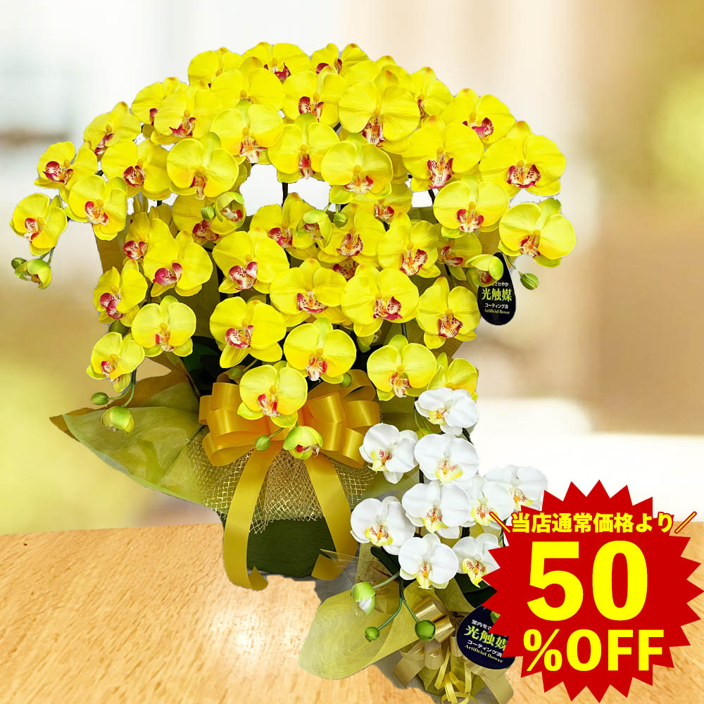 【スーパーSALE 半額】フラワーフェイク こちょうらん 胡蝶蘭 お祝い母の日 造花 黄色 光触媒 7本立ち イエロー ミディ 開店 誕生日 ギフト 出産内祝い 木札 おうち時間 空気 清浄 クリニック 歯科 ジム スポーツ 居酒屋 就任 引越し 開院 開業 敬老の日