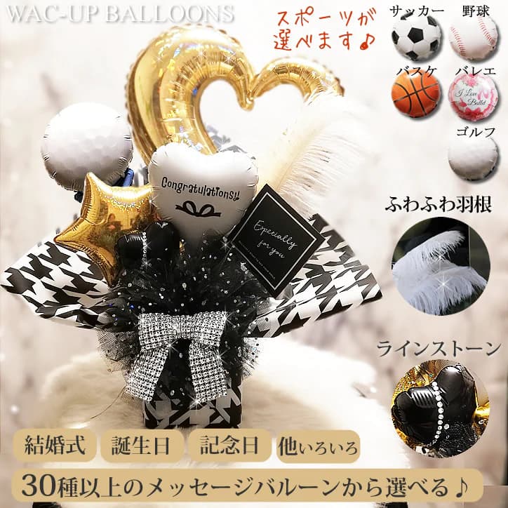 ★ブラック×ゴールドの大人なエレガント系スポーツ卓上型バルーンアレンジギフト★ ゴルフのほか、サッカー バレエ テニス 野球 バレーボール バスケットボール のバルーンから選べます♪ ブラック×ゴールドなら大人な男性やゴルフ仲間、先輩、後輩などの結婚式や誕生日、入学祝い、卒業祝いなどにピッタリ♪ ドット柄のオーガンジーを使った大人可愛いふわふわリボンをメインにキラキララインストーンとキラキラバルーンできらめき感UP☆ 可愛らしい存在感のあるシャンパンゴールドのオープンハートはプリズム加工入りでキラッキラ! そして、、、ふわふわの羽根が品の良さとエレガントさを引き立てます。 お名前や数字の文字入れできます (有料オプション) お好きなメッセージバルーンを選べます。 ウェディング 結婚祝いプレゼント 還暦(赤のお祝い) お歳暮 挨拶、記念日ギフト、誕生日プレゼントのほか、開店祝・出産祝・バレエ発表会・母の日・入学祝い・卒業祝い・合格祝い・新築祝いなどのお祝いに使えます。 〜選択メッセージ〜 ●結婚おめでとう(WDレースホワイト) ●いろんなおめでとう(ホワイト) ●誕生日祝い(ホワイト) ●記念日おめでとう(ダマスク) ●いつまでもお元気で(ホワイト) ●祝(紅白丸) ●卒業おめでとう(卒業コンフェッティグラッド) ●お疲れ様でした(ホワイト) ●吹出し円形(レターシール別料金) ●上記以外のバルーンも選べます 『上記以外のバルーンも選べます』を選択した場合は、 こちらの選択スティックバルーン一覧へのリンクから選び、一緒に注文してください。 この商品ページ内にある「選択バルーン一覧」の画像リンクからも選択バルーン一覧のページへいけます。 【含まれるもの】 ・無料メッセージカード ・セロハンラッピング 素材:アルミバルーン ※端末の発色具合によって現物の色と異なる可能性があります。 ☆文字入れ有料オプション:500円(税別) ミニバルーン専用文字シール(アルファベットと数字のシール)で お名前や数字の文字入れできます。 文字入れシールの追加はこちらから。 ☆数字バルーンを追加:500円(税別) 卓上バルーンアレンジメントに数字のバルーンを1個追加できます。 数字のバルーンの追加はこちらから。選択バルーン一覧へはこちらから ☆文字入れ有料オプション:500円(税別) ミニバルーン専用文字シールでお名前や数字の文字入れできます。 文字入れシールの追加はこちらから ◆アルファベット<大文字のみ>と数字<0〜9>と<&>と<赤ハートマーク>があります。 スラッシュ「/」、点「・」、ビックリマーク「!」など記号はありません。 ◆限られたスペースですので、配置はおまかせください。 また、シールの色指定はできません。m(_ _)m ◆スペース上、一番狭い場所で横5-6文字、一番広い場所で横8文字までという感じです。 ◆柄の入ったバルーンにはおすすめできません。柄の上にシールを貼っても、汚く見えてしまうためです。 ☆数字スティックバルーンを追加:500円(税別) 卓上バルーンアレンジメントに数字のバルーンを1個追加できます。 数字のバルーンの追加はこちらから 数字バルーンで特別感UP! 周年記念の数字や年齢など 記念の数字を入れると、特別感アップ!世界に一つだけの特別なプレゼントになります。