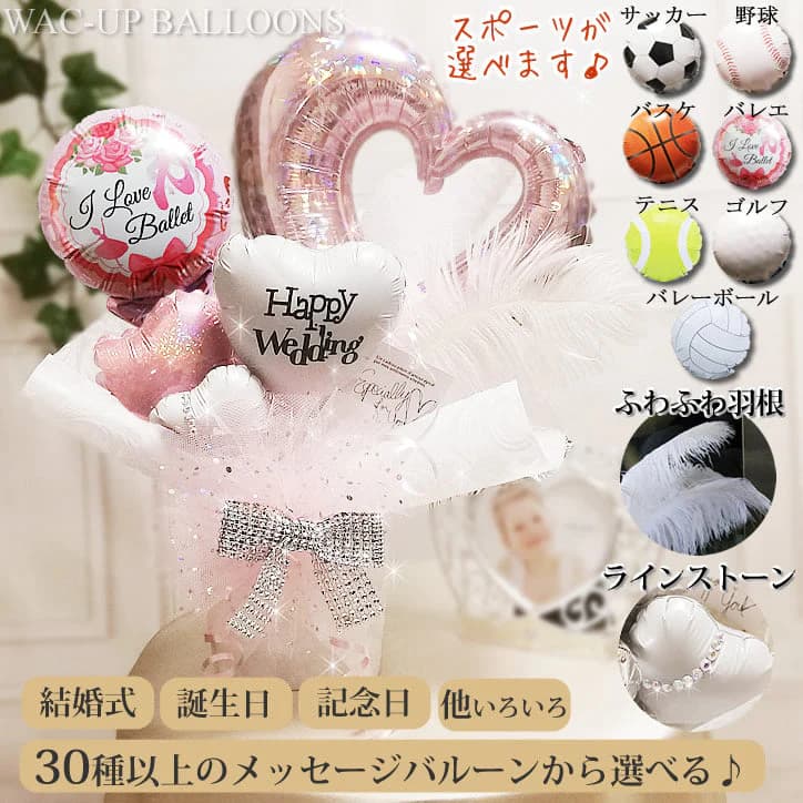 ★パステルピンクを使った可愛いくて上品なスポーツ系卓上型バルーンアレンジギフト★ バレエほか、テニス、バレーボール、ゴルフ、野球、サッカー、バスケットボールのバルーンから選べます♪ バレエなどのスポーツ系×可愛くてエレガントなバルーンアレンジならチームメート、先輩、後輩などの結婚式や誕生日、入学祝い、卒業祝いなどにピッタリ♪ ドット柄のオーガンジーを使った大人可愛いふわふわリボンをメインにキラキララインストーンとキラキラバルーンできらめき感UP☆ 可愛らしい存在感のあるシャンパンゴールドのオープンハートはプリズム加工入りでキラッキラ! そして、、、ふわふわの羽根が品の良さとエレガントさを引き立てます。 お名前や数字の文字入れできます (有料オプション) お好きなメッセージバルーンを選べます。 ウェディング 結婚祝いプレゼント 還暦(赤のお祝い) お歳暮 挨拶、記念日ギフト、誕生日プレゼントのほか、開店祝・出産祝・バレエ発表会・母の日・入学祝い・卒業祝い・合格祝い・新築祝いなどのお祝いに使えます。 〜選択メッセージ〜 ●結婚おめでとう ●いろんなおめでとう ●誕生日祝い ●記念日おめでとう ●出産おめでとう ●バレエ ●母の日 ●入学おめでとう ●卒業祝い ●ありがとう ●お疲れ様でした ●いつまでもお元気で ●上記以外のバルーンも選べます 『上記以外のバルーンも選べます』を選択した場合は、 こちらの選択スティックバルーン一覧へのリンクから選び、一緒に注文してください。 この商品ページ内にある「選択バルーン一覧」の画像リンクからも選択バルーン一覧のページへいけます。 【含まれるもの】 ・無料メッセージカード ・セロハンラッピング 素材:アルミバルーン ※端末の発色具合によって現物の色と異なる可能性があります。 ☆文字入れ有料オプション:500円(税別) ミニバルーン専用文字シール(アルファベットと数字のシール)で お名前や数字の文字入れできます。 文字入れシールの追加はこちらから。 ☆数字バルーンを追加:500円(税別) 卓上バルーンアレンジメントに数字のバルーンを1個追加できます。 数字のバルーンの追加はこちらから。選択バルーン一覧へはこちらから ☆文字入れ有料オプション:500円(税別) ミニバルーン専用文字シールでお名前や数字の文字入れできます。 文字入れシールの追加はこちらから ◆アルファベット<大文字のみ>と数字<0〜9>と<&>と<赤ハートマーク>があります。 スラッシュ「/」、点「・」、ビックリマーク「!」など記号はありません。 ◆限られたスペースですので、配置はおまかせください。 また、シールの色指定はできません。m(_ _)m ◆スペース上、一番狭い場所で横5-6文字、一番広い場所で横8文字までという感じです。 ◆柄の入ったバルーンにはおすすめできません。柄の上にシールを貼っても、汚く見えてしまうためです。 ☆数字スティックバルーンを追加:500円(税別) 卓上バルーンアレンジメントに数字のバルーンを1個追加できます。 数字のバルーンの追加はこちらから 数字バルーンで特別感UP! 周年記念の数字や年齢など 記念の数字を入れると、特別感アップ!世界に一つだけの特別なプレゼントになります。