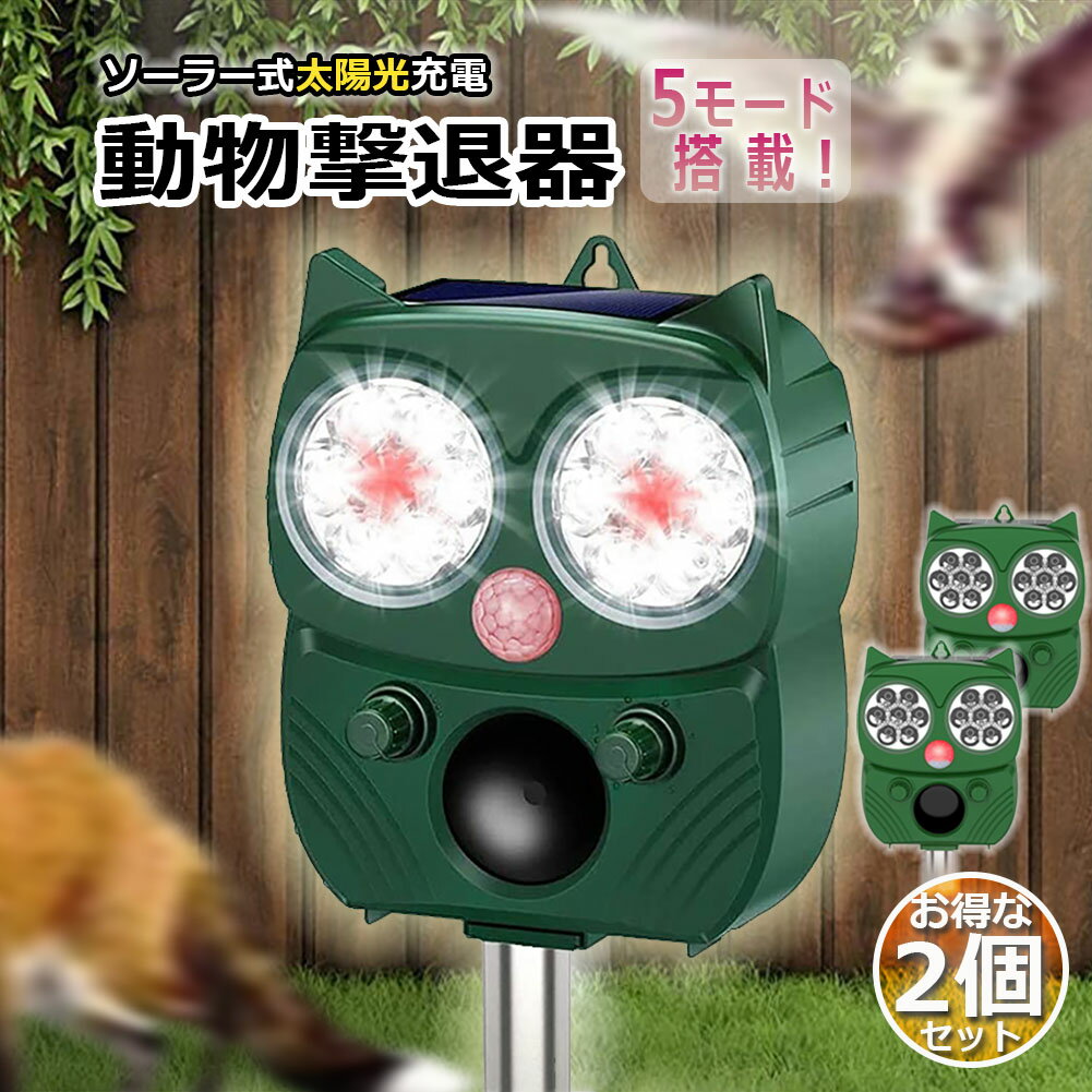 動物撃退器 害獣撃退器 2個セット 超音波 フラッシュライト 警報音 広範囲 センサー ソーラー 太陽光 USB充電式 防水 5モード 猫 鳥 ネズミ 犬 害獣 よけ 簡単 設置 ガーデン 畑 家庭菜園 キャンプ 登山 エコ 省エネ