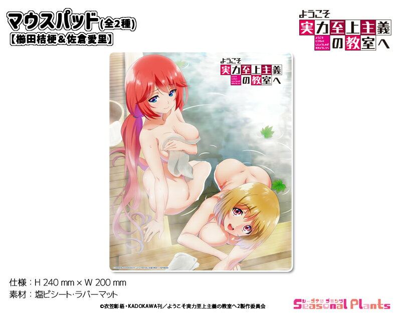 TVアニメ『ようこそ実力至上主義の教室へ』より、マウスパッドが全2種で登場致します! 堀北鈴音と一之瀬帆波、櫛田桔梗と佐倉愛里それぞれのセクシーなイラストを使用致しました。 可愛らしいイラストでパソコンでの作業も楽しくなりそうですね♪ 大きめサイズのしっかりとしたマウスパッドで、印刷も綺麗!コレクションとして飾ってもお楽しみいただけます! 表面は撥水加工されておりますので、色落ち・劣化しづらいので長期のご利用が可能です。 そして、万が一汚れてしまっても水拭きで簡単に綺麗にすることができる優れたアイテムです。 -------------------------------------------------- [仕 様] H240mm×w200mm [素 材] 塩ビシート・ラバーマット -------------------------------------------------- ©衣笠彰梧・KADOKAWA刊/ようこそ実力至上主義の教室へ2製作委員会