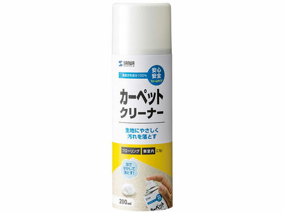 ※お客様のご都合による商品の返品・交換・キャンセルは受け付けておりません。商品仕様をご確認の上、お間違いの無いようお願い致します。◆メーカー:サンワサプライ ◆品名:カーペットクリーナー ◆品番:CD-106(CD106) ◆容量:200ml ◆成分:界面活性剤(ポリグリセリン脂肪酸エステル)、アルカリ剤(炭酸塩) ◆サイズ:W53×D53×H180mm ◆重量:262g ◆カーペットやじゅうたんに付着したしつこい汚れやシミを落とします。 ◆フローリングの原状回復としても使用できます。 ◆原料は食品に使用されている成分で安心して使用できます。 ◆沖縄県は配送不可となります。ご了承下さい。 ※品番通りのお手配になりますのでご注文前に必ず商品の仕様・サイズ・品番・色等を確認の上ご注文お願いします。 当店のお買い物ガイドも併せてご確認ください。
