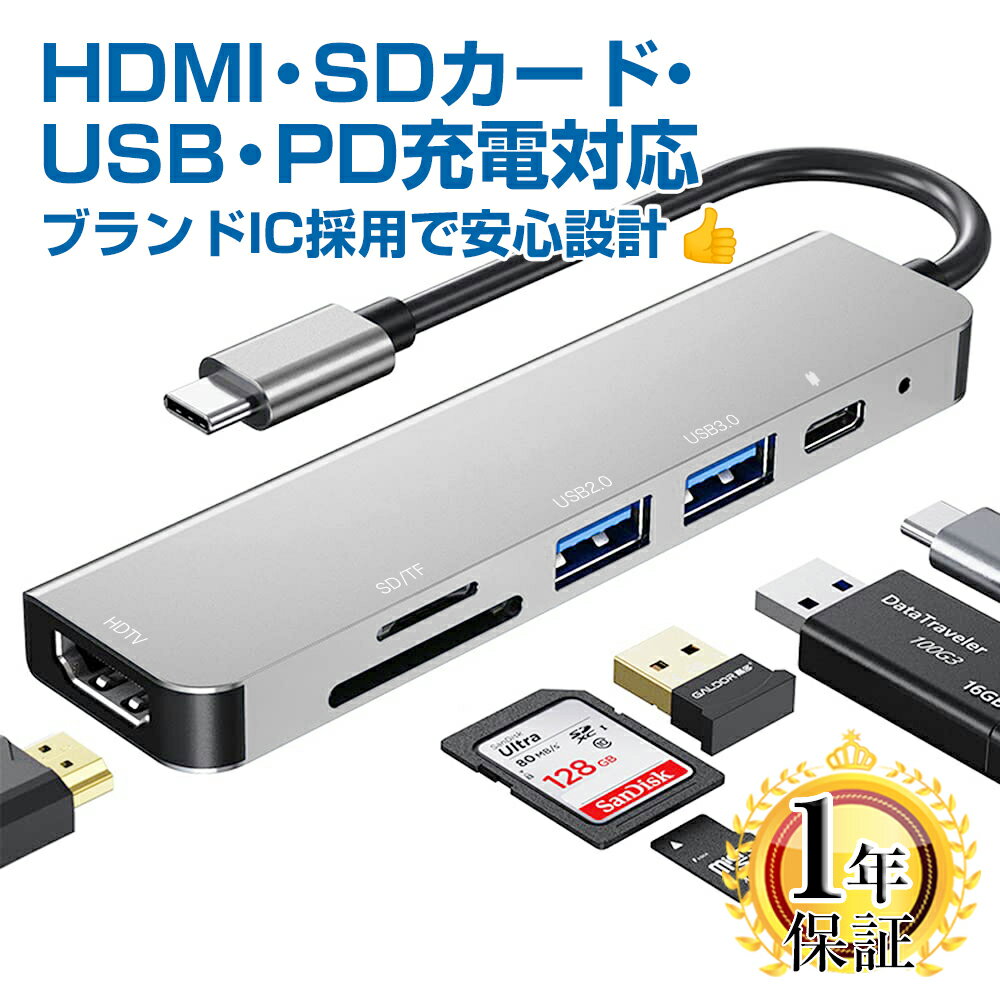 楽天1位獲得 USB Type-C ハブ HDMI 6-IN-1 1年保証 [ 4K HDMI+USB 3.0+USB 2.0+PD充電 87W対応+SDカードリーダー ] タイプc usbc hdmiケーブル 変換 アダプタ thunderbolt c端子 USB4 アダプタ Apple MacBook Mac Book Pro iMac Galaxy S25 S24 iPhone17 Pro |pre