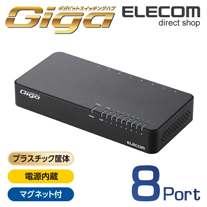 スリム&コンパクトボディのGiga対応スイッチングハブリビングになじむスタイリッシュなデザイン本商品は、スタイリッシュなデザインのGiga対応のスイッチングハブです。スイッチングハブとは、通信を行う機器同士の情報を判別し自動的に適切な通信を行う機器で、ネットワーク対応のプリンター、パソコン、ゲーム機やテレビなどを接続しネットワークに参加させることができます。本商品の設計にあたっては、スイッチングハブの使用シーンが従来のパソコン周辺のみならず、リビングや寝室など幅広いシーンへと拡大していることを鑑み、どこに置いてもインテリアを邪魔しないスタイリッシュなデザインを目指しました。■マグネットで金属壁面へ、別途ネジ用意で非金属壁面へ取り付け可能標準添付のマグネットで金属壁面への取り付けが簡単に行えます。スチールのデスクやラックへの取り付けにも最適です。また、マグネットが使えない非金属壁面へは、壁面取り付け穴での取り付けが可能です。※壁掛け用ネジ(2本)は別途ご購入ください。■ACアダプター不要の電源内蔵タイプでコンセント周りがすっきりかさばるACアダプターの必要ない電源内蔵タイプなので煩雑になりがちなコンセント周りが非常にスッキリします。■高い静音性を実現するファンレス筐体ファンレス設計で高い静音性を実現しました。オフィスなどでの使用においても音を気にすることなくご使用いただけます。また、可動部分をなくすことで信頼性も向上しています。 ■より放熱性に優れ信頼性の高い金属筐体ハブはパソコンと同様に動作時にチップなどから放熱し、筐体内部の温度が上昇します。金属筐体のハブならその熱を効率良く逃がすことができるため、筐体内の温度上昇を抑えることができます。温度が上がりやすい環境下でのご利用に最適です。おまかせ節電+おまかせ節電NEXT機能2つの自動節電機能で賢く省エネ■使用中のポートのみに電力供給する「おまかせ節電機能」自動電力調節機能「おまかせ節電」機能により、ポートの使用状態を自動判断し、電源がOFFになっているPCが接続されたポートや未使用のポートの機能を制限することで消費電力を削減します。夜間に多くのパソコンがシャットダウンされるオフィスや、昼間はパソコンが使われることの少ない自宅などで大幅な電力の節約を実現します。また、接続されているLANケーブルの長さも自動で判別し、ケーブル長に応じて信号レベルが自動で調整され、それに応じて消費電力も増減します。■データ転送していないポートには電力供給を制限する「おまかせ節電NEXT機能」データの流れていないときの消費電力をカットする「おまかせ節電NEXT(IEEE 802.3az)」機能を搭載。本商品に接続されたパソコンなどの電源がON状態でも、通信を行わない期間はアイドリング信号を止めることで大幅に消費電力を抑えます。通常使用時においても大幅な節電を実現します。安定したネットワークの構築をサポートループ検知機能でネットワーク障害を軽減する■ループ検知機能ネットワーク運用に大きな障害を及ぼす、ネットワークループの発生を検知し、お知らせするループ検知機能を搭載。発見が困難で、障害の影響も大きかったネットワークループを迅速に発見し、ネットワーク障害の回復を早めます。■ループ発生をランプの点滅でお知らせループ発生時には、ループ発生したことをお知らせするために、ループ検知のランプが「赤色」に点滅します。また、どのポートでループが発生したかが分かるよう、発生したポートのランプが点滅。迅速なループ排除が可能です。ループ検知機能をスイッチで切り替えループ検知機能のON/OFFは、前面パネルのLOOP検知スイッチで簡単に切り替えいただけます。金属筐体・安定動作で設置しやすく家庭・小規模オフィス用ハブに最適搭載している8ポート全てがGigabitイーサネット(1000BASE-T)に対応。GigaLAN端子搭載パソコンやネットワーク対応HDD(NAS)〈テラステーション/リンクステーション〉とのGiga接続が可能、高速ネットワーク環境をスマートに実現します。さらに、イーサネットの送信パケットサイズを大きくして、ネットワーク上の転送効率を向上させる“Jumbo Frame”に対応。Gigaの高速性能を引き出します。接続された機器で快適にインターネットを楽しめます。