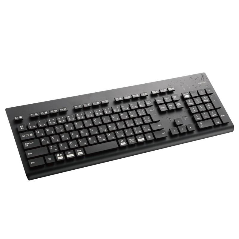 エレコム 洗える ワイヤレスキーボード Bluetooth 防水 IPX5対応 メンブレン フルサイズ テンキー付 抗菌 ブラック TK-WS03BMKBKキーの隙間にたまったホコリを、丸洗いで簡単に除去可能。不意の水濡れでも心配ない、防水タイプのBluetooth(R)キーボードです。IPX5対応の防水設計で水洗いが可能なため、キーボード本体を清潔に保てます。キートップを浮かせた“アイランドタイプ"のデザインを採用。トップケースの凸凹が少ないフラットな設計により、水が溜まりにくく排出もしやすいため、お手入れが簡単です。風が通りやすい設計のため、エアダスターでの掃除にも適しています。誤って飲み物などの液体をキーボードにこぼしても、本体裏面の水抜き穴からすぐに排出できる“排水機構"を搭載しています。