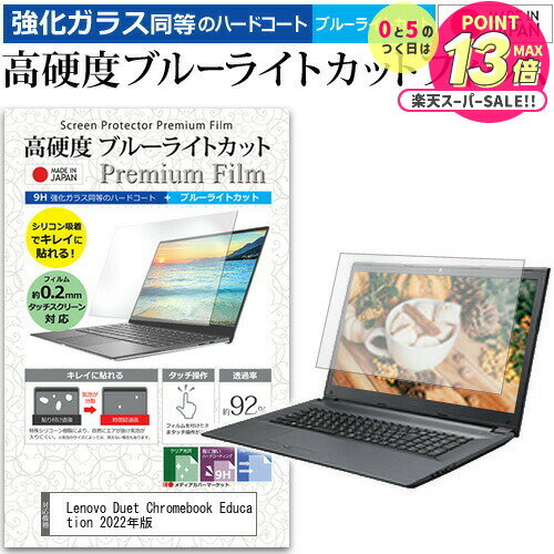 【硬度9Hでキズに強く、目に優しいブルーライトカット液晶保護フィルム】Lenovo Duet Chromebook Education 2022年版 [10.95インチ(2000x1200)] 用 液晶保護 フィルム カバー シート クリア 光沢 ブルーライトカット 高硬度9H PET製 強化ガラス同等対応機種Lenovo Duet Chromebook Education 2022年版 [10.95インチ(2000x1200)] 主な仕様◆液晶保護フィルム特徴・ガラス同等の表面硬度(8〜9H)を持つPET製フィルムで、キズに強く液晶画面をしっかり保護します。・ブルーライトを平均約30%カット(波長380〜495nm)。目の負担を軽減します。・透過率92%で自然な見た目を保ち、クリアで美しい表示を実現!・日本製フィルムを採用。品質と信頼性を確保しています。・吸着面はシリコン素材で自己吸着タイプ。貼り直し可能で扱いやすい仕様です。・気泡除去用ヘラとクリーニングクロスが付属します。取付方法・剥離フィルムを剥がす前にサイズを確認してください。・剥離フィルムを少しずつ剥がしながら位置合わせをして貼り付けてください。・一気に剥がすと大量の気泡が入りやすいためご注意ください。ご購入前の注意点・機器本体は付属しておりません。・本製品は液晶画面表示領域のみをカバーする仕様です。ディスプレイ全体を覆う仕様ではございません。・貼付作業は丁寧に行ってください。気泡発生や破損の原因となります。・落下等による衝撃や機器破損については責任を負いかねます。・記載された製品名やブランド名は、適合サイズの説明の便宜上使用しており、各社の商標または登録商標です。・当製品は互換品となります。公式メーカーが販売、製造するものではございません。純正品ではないことをご了承ください。ブランドメディアカバーマーケットは、パソコン・タブレット・スマートフォンなどの保護フィルムを専門に製造・販売する国内ブランドです。豊富な機種対応と法人・教育機関での導入実績を誇ります。品質保証液晶保護フィルムは消耗品のため、未使用(貼り付け前・保護シート未剥離)の状態に限り返品・交換を承っております。商品到着時、ご注文と異なる商品が届いた場合や、初期不良などがある場合、1週間以内にメールにてご連絡ください。商品のお取り換え、もしくはご返金をさせていただきます。詳しくは返品ポリシーをご覧ください。Lenovo Duet Chromebook Education 2022年版 [10.95インチ(2000x1200)] 用 高硬度9H液晶保護フィルム。ガラス同等の硬度でキズに強く、ブルーライトをカットして目の負担を軽減!クリア光沢仕様で自然な色合いを維持。日本製フィルム採用で高品質。法人・教育機関への導入実績豊富な国内ブランド【メディアカバーマーケット】保護 フィルム カバー シート■対応機種Lenovo Duet Chromebook Education 2022年版 [10.95インチ(2000x1200)]Lenovo Duet Chromebook Education 2022年版 [10.95インチ(2000x1200)]で使える 強化ガラス同等の硬度9H ブルーライトカット クリア光沢 液晶保護フィルム●液晶保護フィルム特徴PET製でも、ガラスと同じ表面硬度だから、キズに強い・ガラス同等の表面硬度(8〜9H)で、キズがつきにくく、画面を美しく保ちます。ブルーライトを大幅にカット・380〜495nmのブルーライトをカットしています。・ブルーライトカット率 平均約30%光をキレイに映し出し、クリアな画面を実現。・透過率92%という高い透過率。・液晶画面に貼った際に色かぶりがなく、自然な見た目になります。日本製のフィルムを使用しています。吸着面は、貼ってはがせるシリコン素材で自己吸着タイプ。ずれて貼ってしまった場合でも貼り直しが可能です。気泡を抜くためのヘラとクリーニングクロス付き。 ※ご購入前の注意点※機器本体は付属しておりません剥離フィルムを剥がす前にサイズを確認し、剥離フィルムを少しだけ剥がして、位置合わせをしてから貼り付けてください。一気に剥離フィルムを剥がしてから貼り付けると、大量の気泡が生じやすくなります。ほこり、汚れは気泡の原因となります。画面を綺麗にしてから貼り付けてください。破損の恐れがありますので、取り付けの際には液晶画面を強く押さないよう注意し、丁寧に貼り付けてください。落下物による衝撃、機器の破損・損傷については責任を負いかねます。ブルーライト 高硬度 クリア 光沢 液晶 カバー シート 保護フィルム ノートパソコン ノートPC ノート